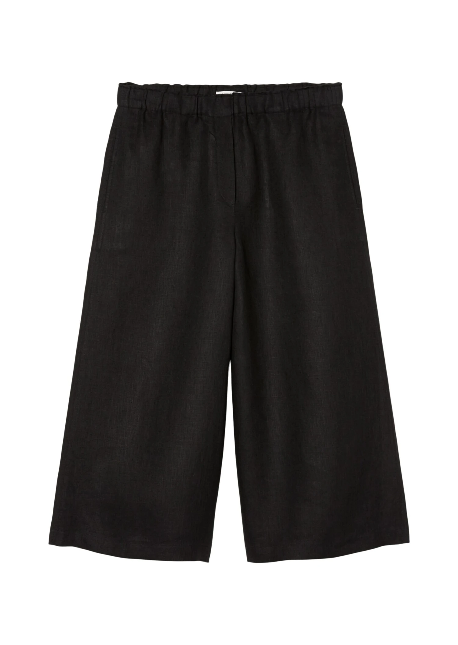 They are the most laid-back trouser trend of the season and a nod to the nonchalant, sporty elegance of the 90s: culottes with an elasticated waistband. The light and feminine design features practical in-seam slit pockets on the sides, one button-fastening piped pocket on the back and a wide, flared leg. Woven in pure hemp fibres, the fabric is elegant and flowing with a natural sheen and an uneven surface finish.