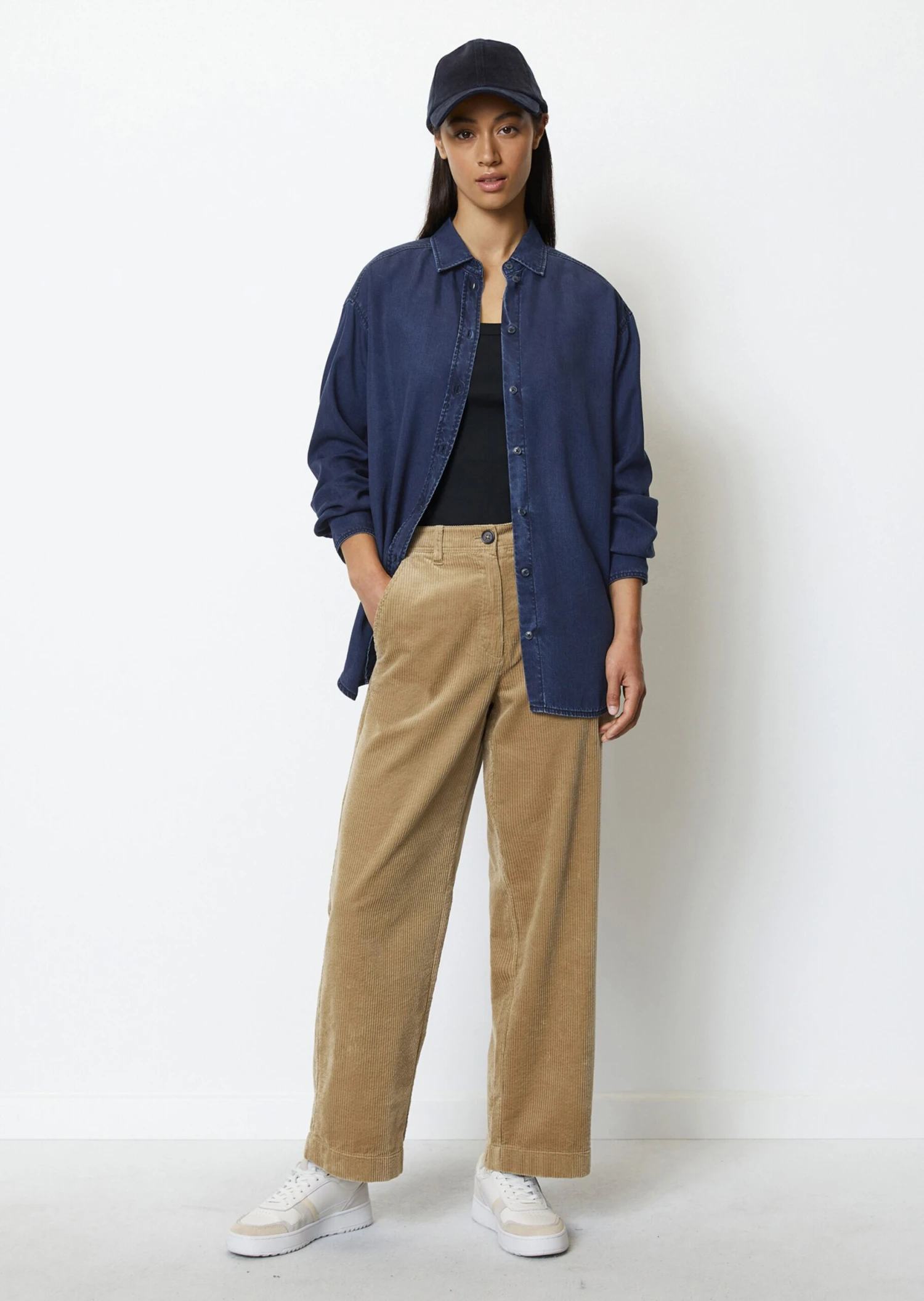 The fashion formula for the coming season is: clean denim shirt and cargo pants. Actually super easy – but in combination it becomes a super-casual and extraordinarily cool look. Especially the noble flowing material made of pure lyocell is responsible for this. Loose-fitting model with modern Kent collar, overcut shoulders, classic sleeve design and casually rounded hem.