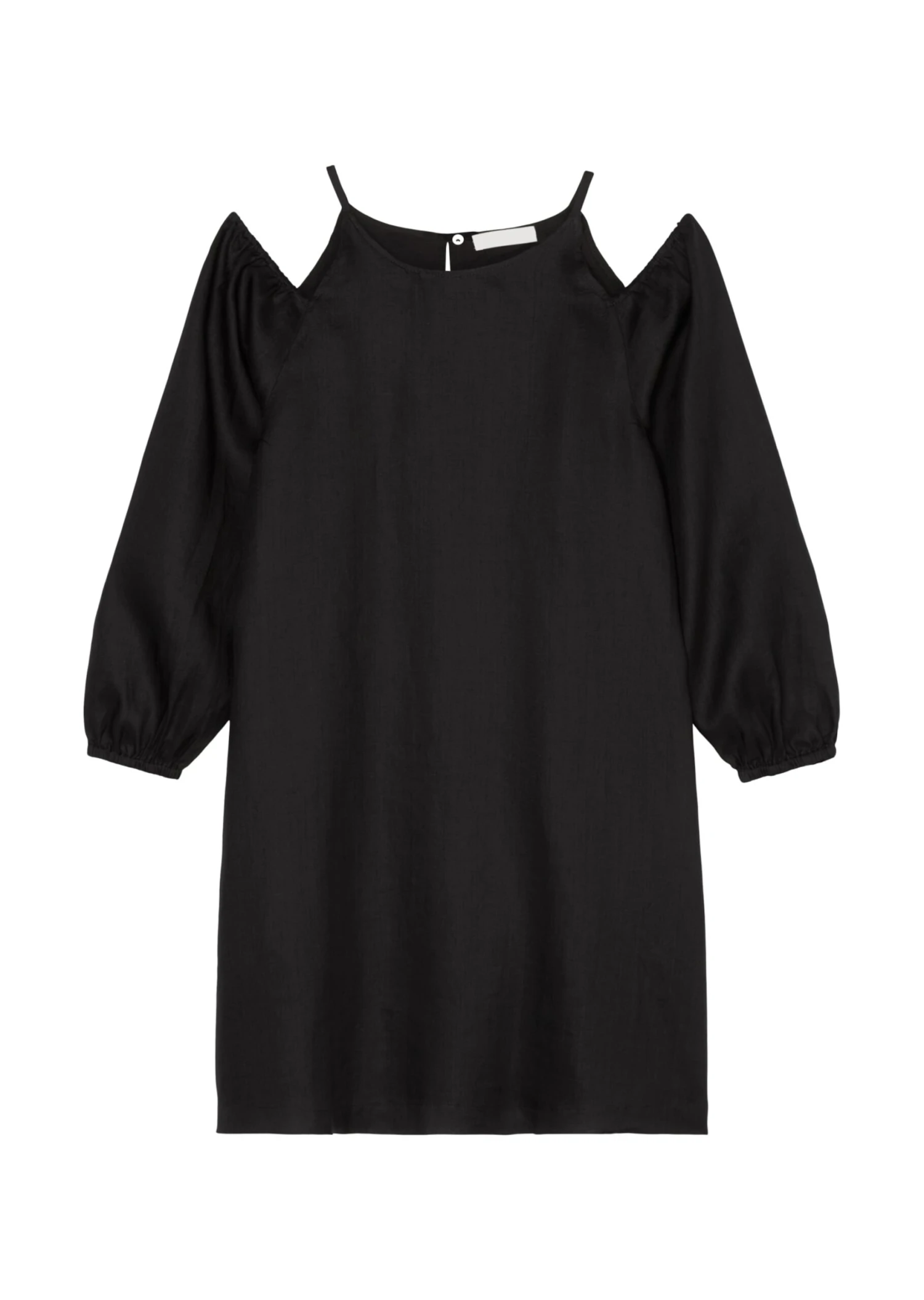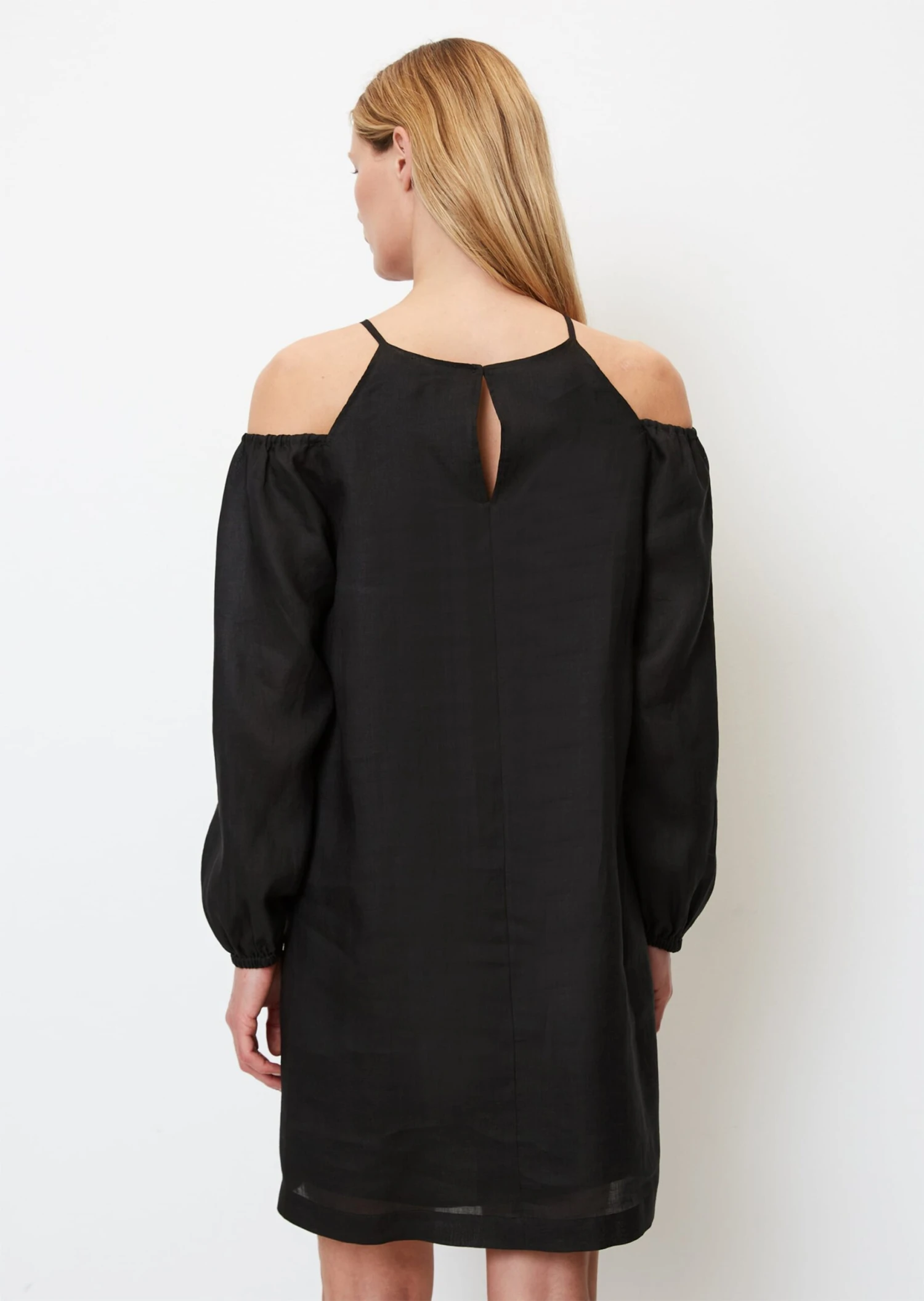 This short, flared A-line dress with cut-out details ensures the maximum wow-effect and puts the focus on your shoulders. Woven in pure Ramie fibre, the material is elegant with a silk-like sheen and is also robust and able to deal with slight wrinkling. The design has short, very thin straps, a “high-fastening” round neckline at the front and back and a button-and-loop fastener at the nape of the neck. The long, Carmen-style puff sleeves are elasticated and gathered at the shoulder and hem. The soft cotton lining ensures breezy comfort in summer. Always the best styling partner: natural, lightly suntanned skin.