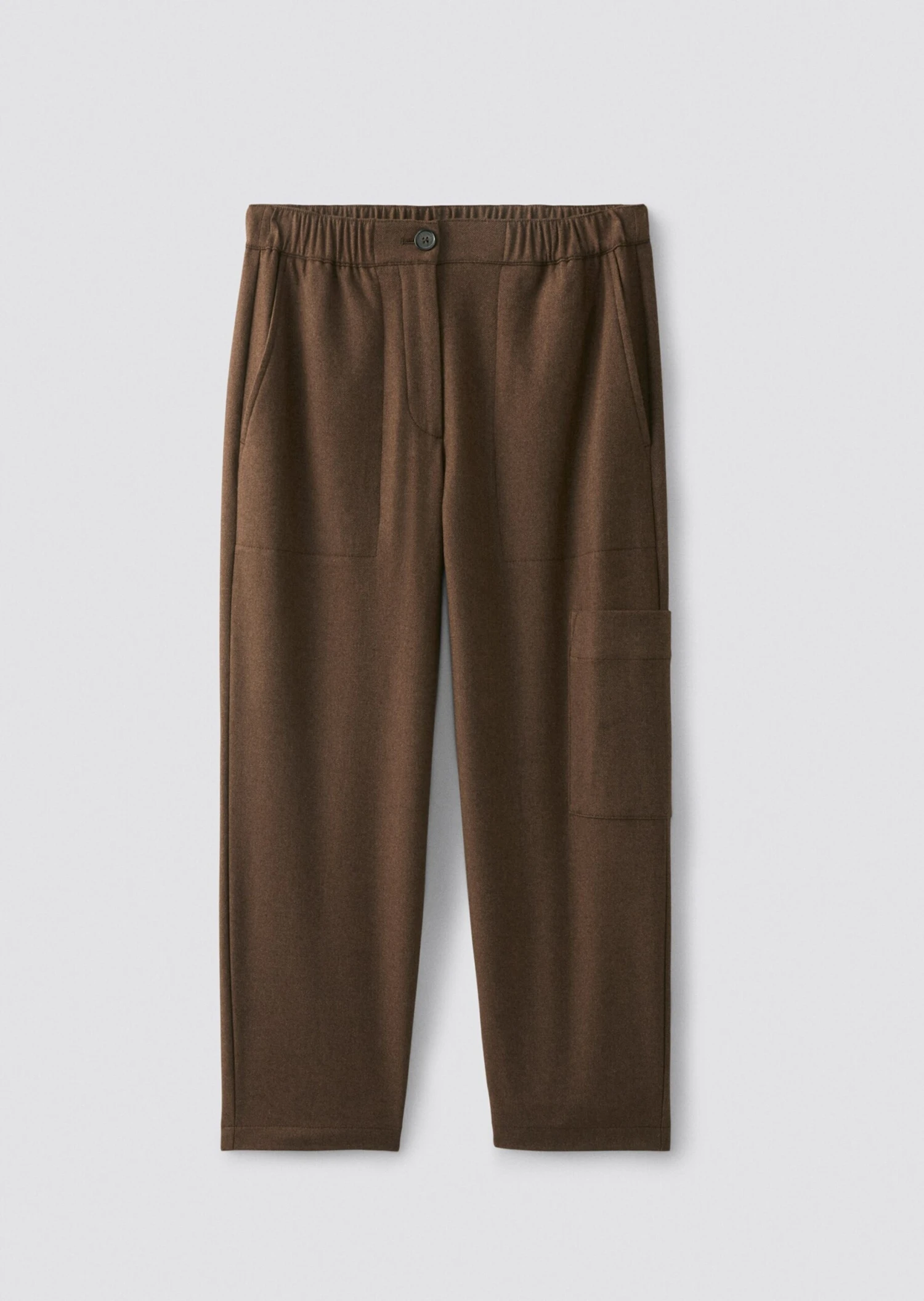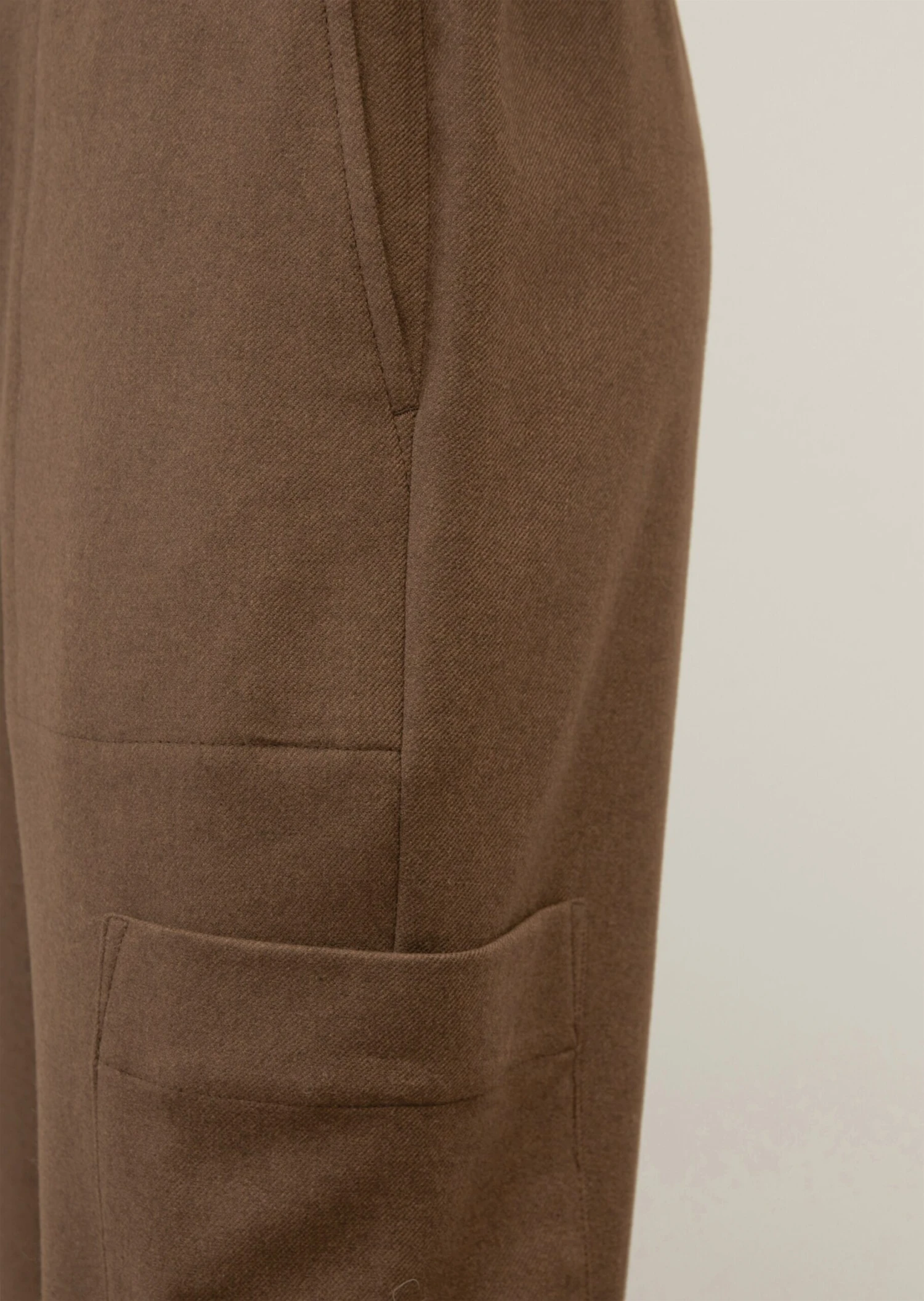 Simply must be styled elegantly, so the look is not too casual: cargo-style tracksuit bottoms in fine, high-quality premium viscose-rich wool blend twill fabric. Teamed with a cosy, high-quality knitted jumper, these tracksuit bottoms will quickly become the new favourite piece in your wardrobe. Relaxed fit in an O-shaped barrel style with French slash pockets, one large patch pocket on the side of the leg and one patch pocket on the back. The waistband is elasticated with a button and zip fly.