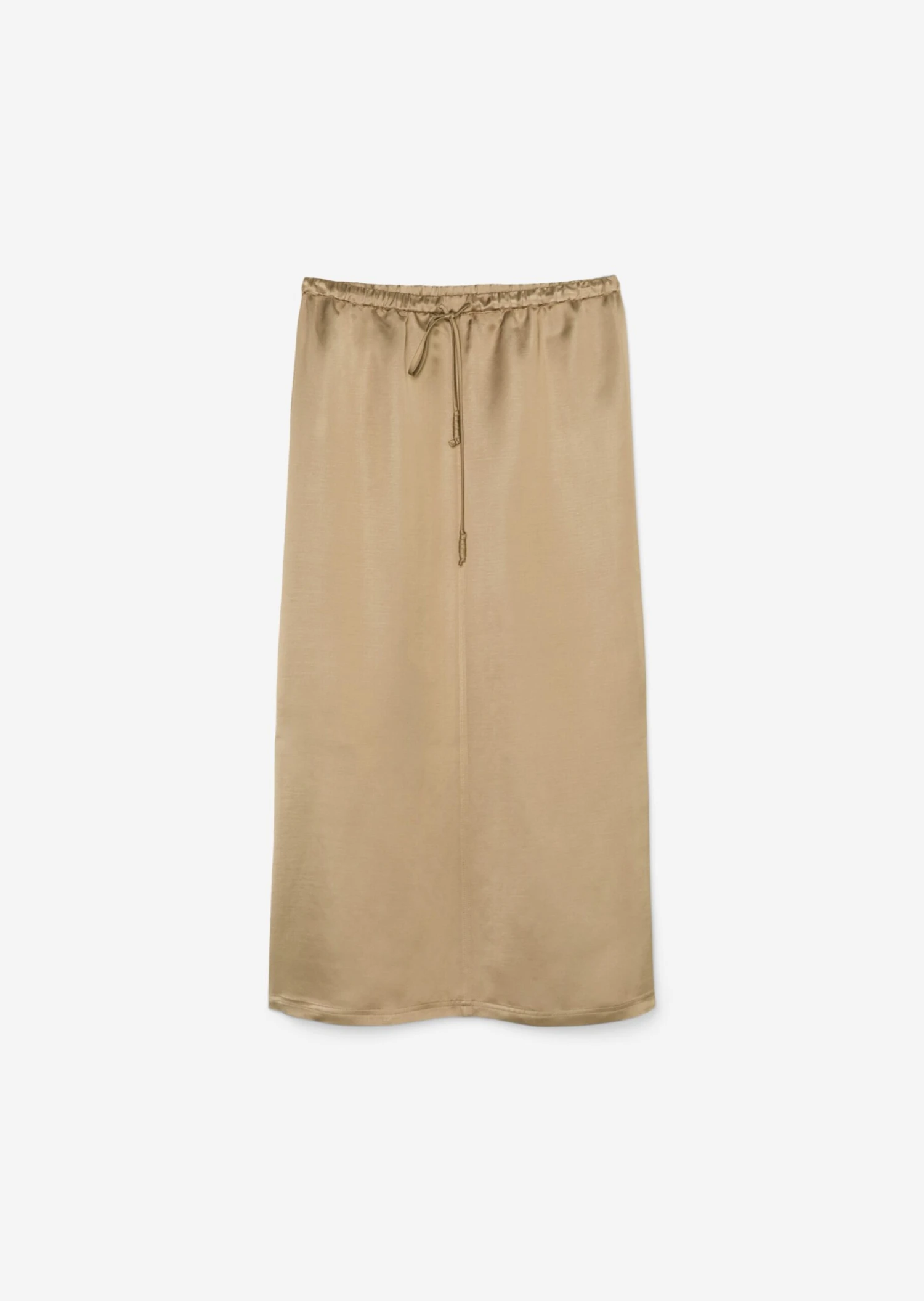 It always looks good with a white T-shirt – a long, flowing A-line skirt made of a high-quality viscose/linen blend. The chic yet sporty design has an elasticated waistband in a tracksuit bottom-style and an elegant outer surface with a matte sheen. The high slits in the side seams of the skirt add drama as you walk while creating a super-casual look. The flared skirt is unlined and has a decorative dividing seam on both the front and back. Styling tip for a fashionable monochrome look: pair with the blouse in the matching colour and fabric.
