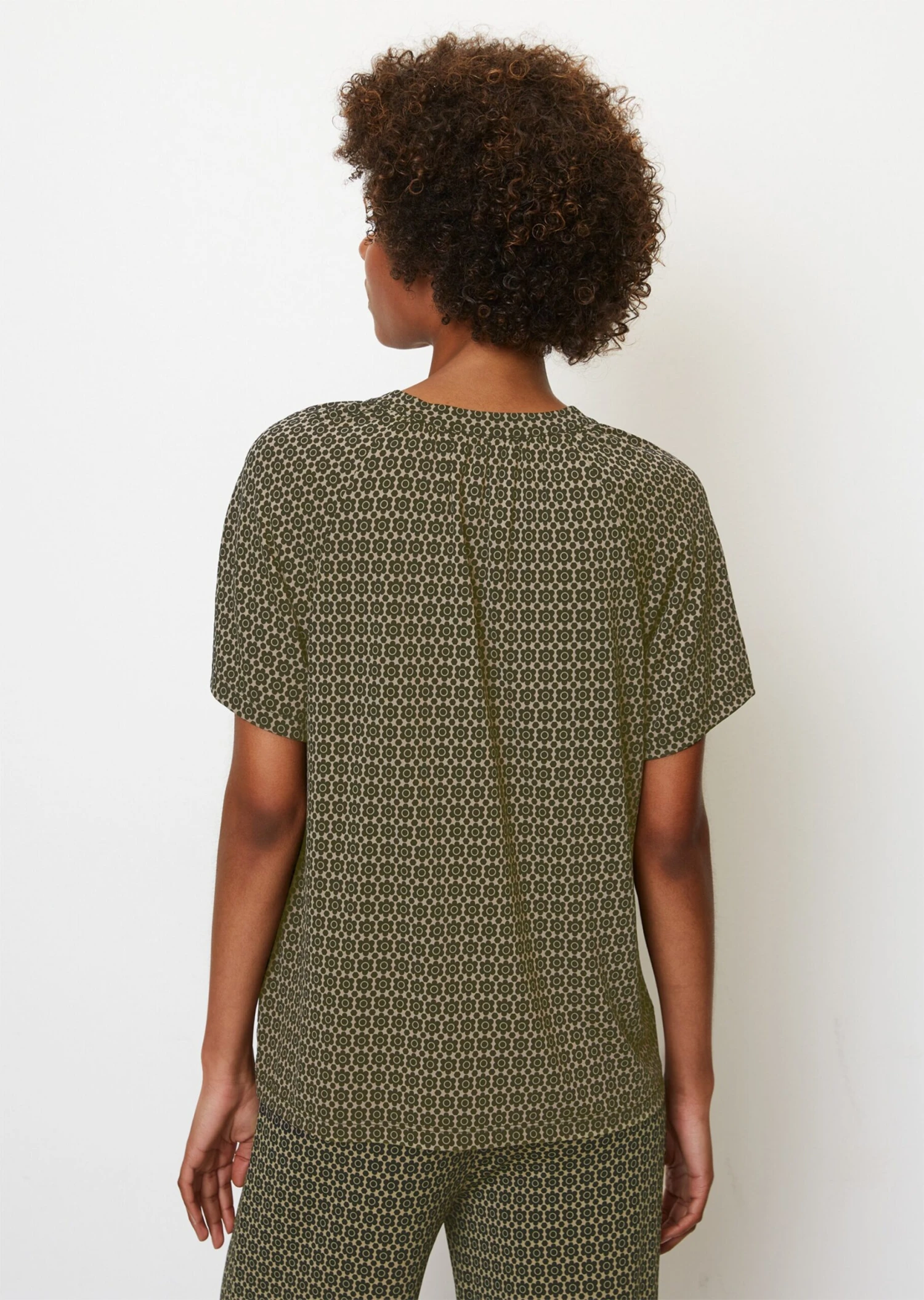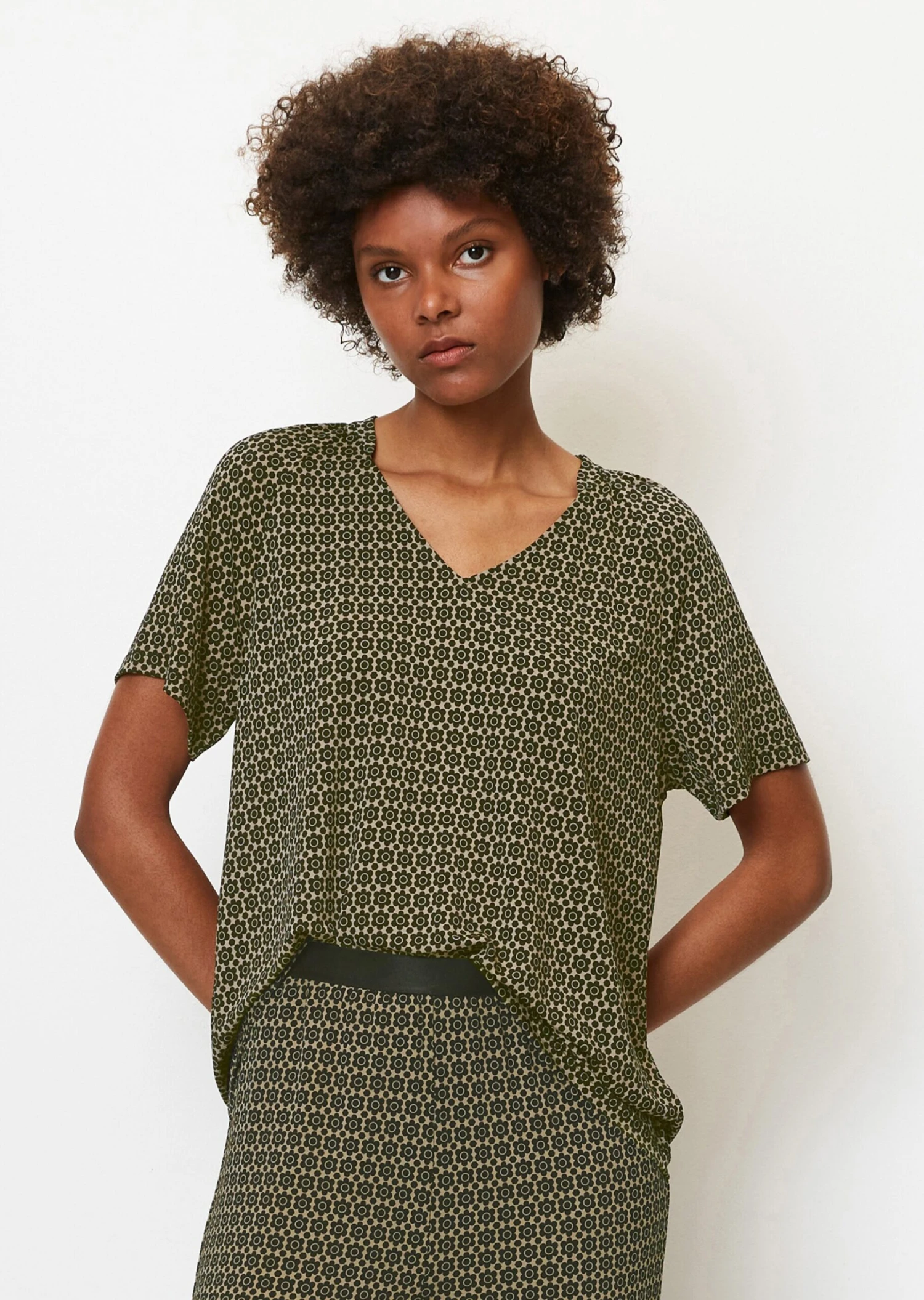 It’s a casual alternative to a classic blouse or a timeless T-shirt – the jersey blouse top. This loose-fitting, regular fit design is made of a high-quality, printed and stretchy viscose blend with short raglan sleeves and a distinctive neckline. The deep V-neck is finished with an additional band collar detail and feminine gathering. The versatile piece is a reliable companion that can be effortlessly teamed with all plain coloured bottoms.