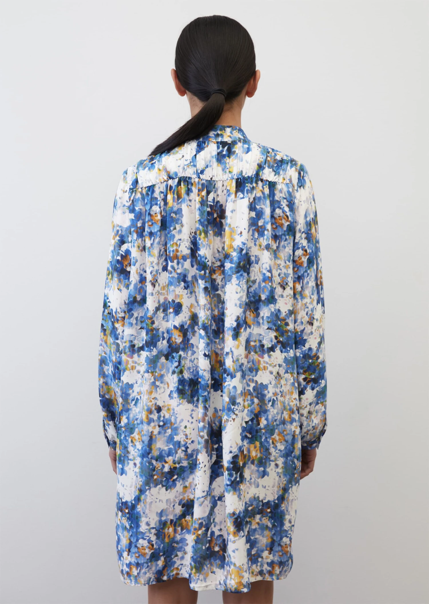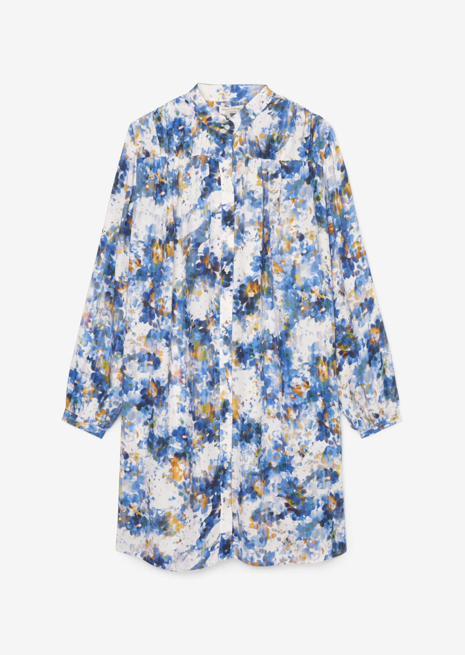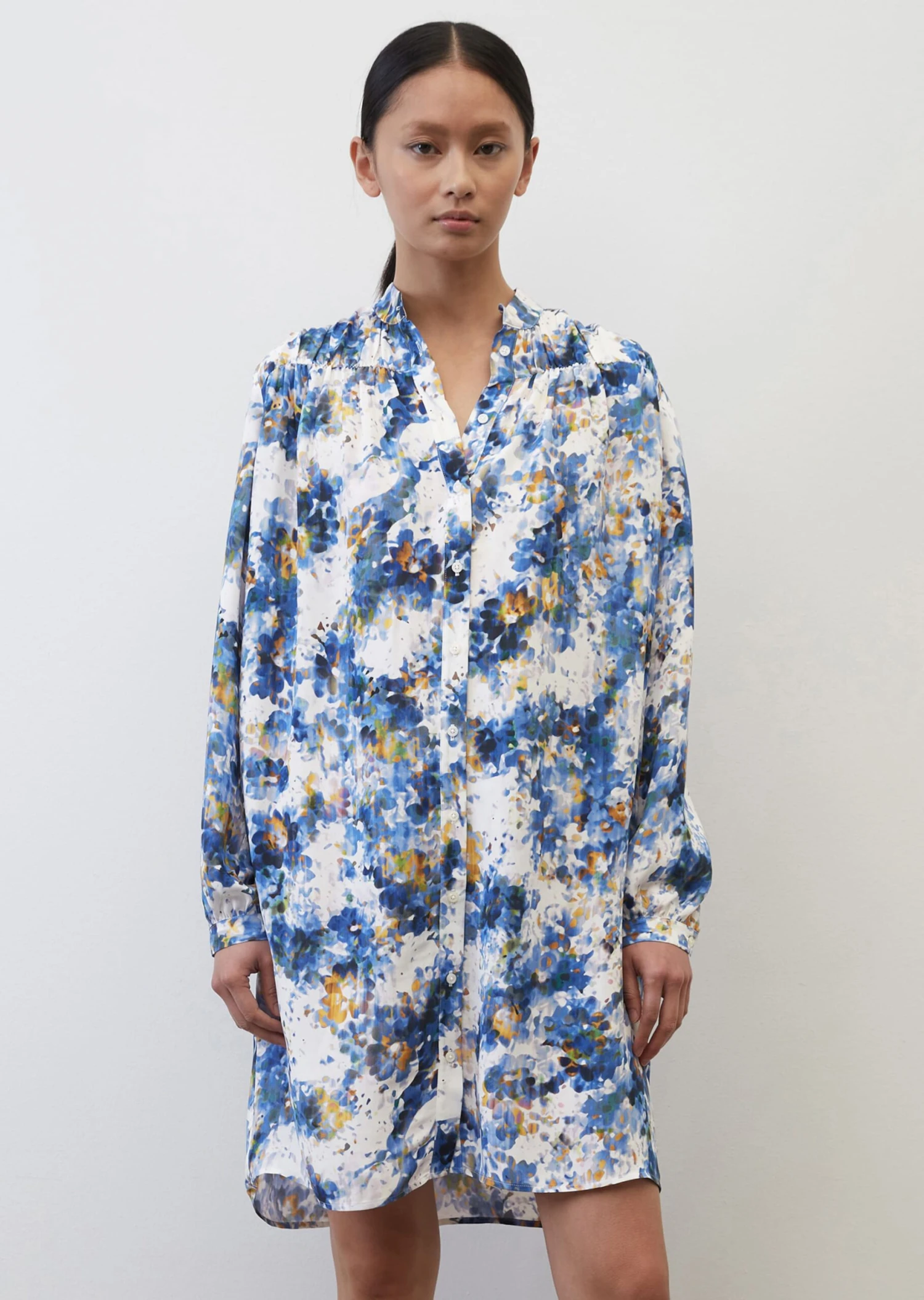 This shirt dress is the perfect length for the office, everyday wear and the beach. It comes in an extremely loose and wide cut with pronounced gathered details on the front and back. The knee-length dress with a stand-up collar has buttons down the front, casual voluminous sleeves with narrow cuffs and two practical in-seam slit pocket on the sides. Thanks to the airy cut and exclusive fabric made of a blend of cupro and viscose, you can wear this dress all summer long.