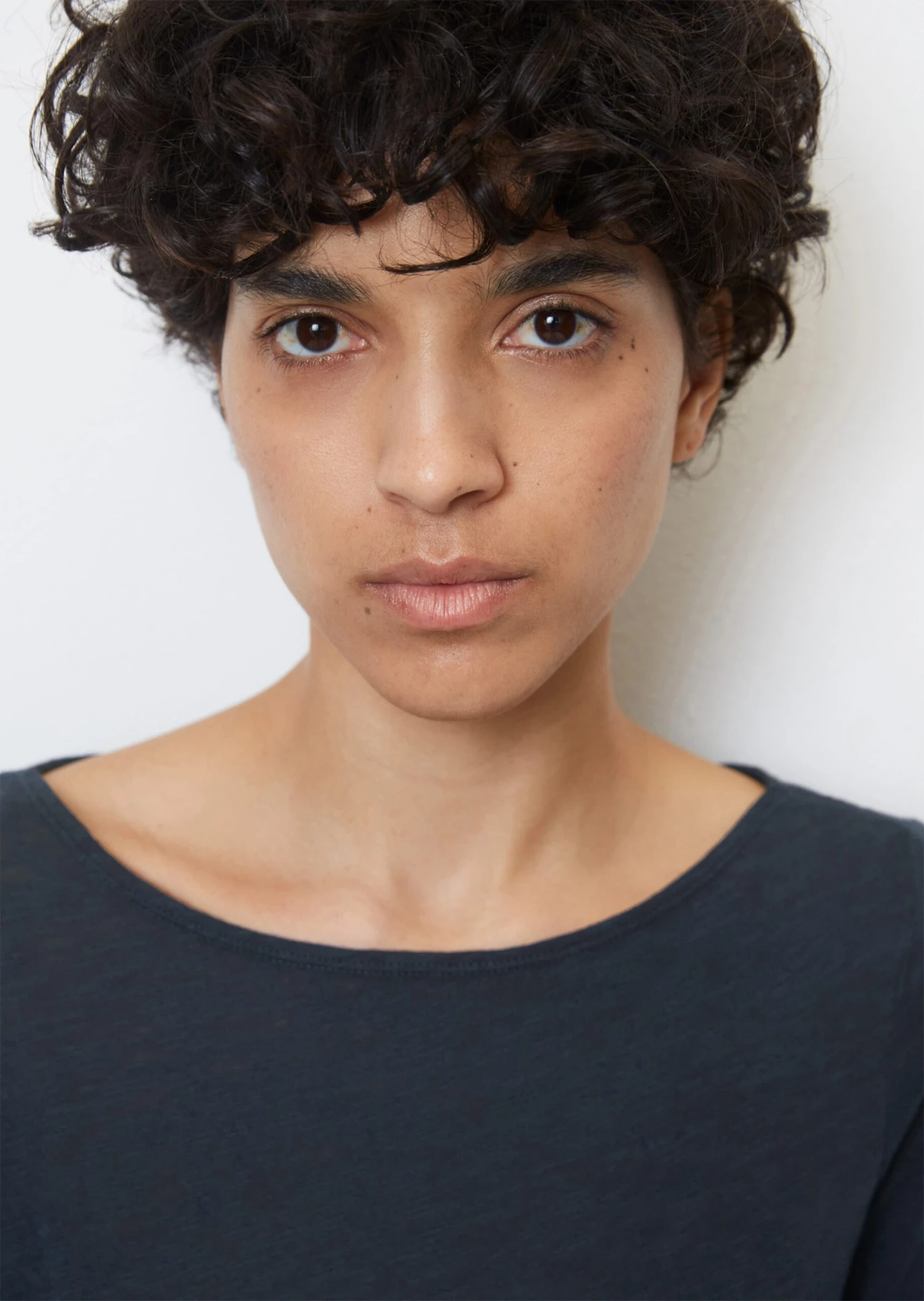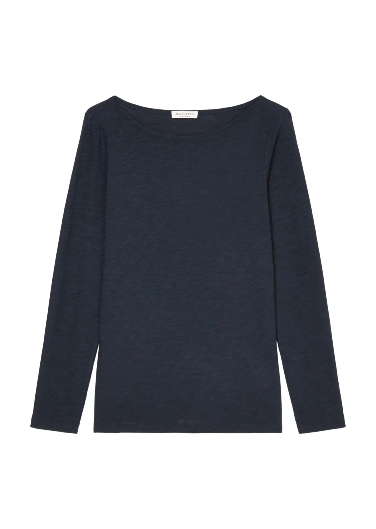 Casual long-sleeved top made from pure organic cotton in a slightly transparent slub jersey fabric. Perfect for layering, for wearing underneath something or simply as a solo piece. Boat neck, slender long sleeves and small logo print on hem. Ultra-soft, pleasant fabric that is very comfortable to wear.