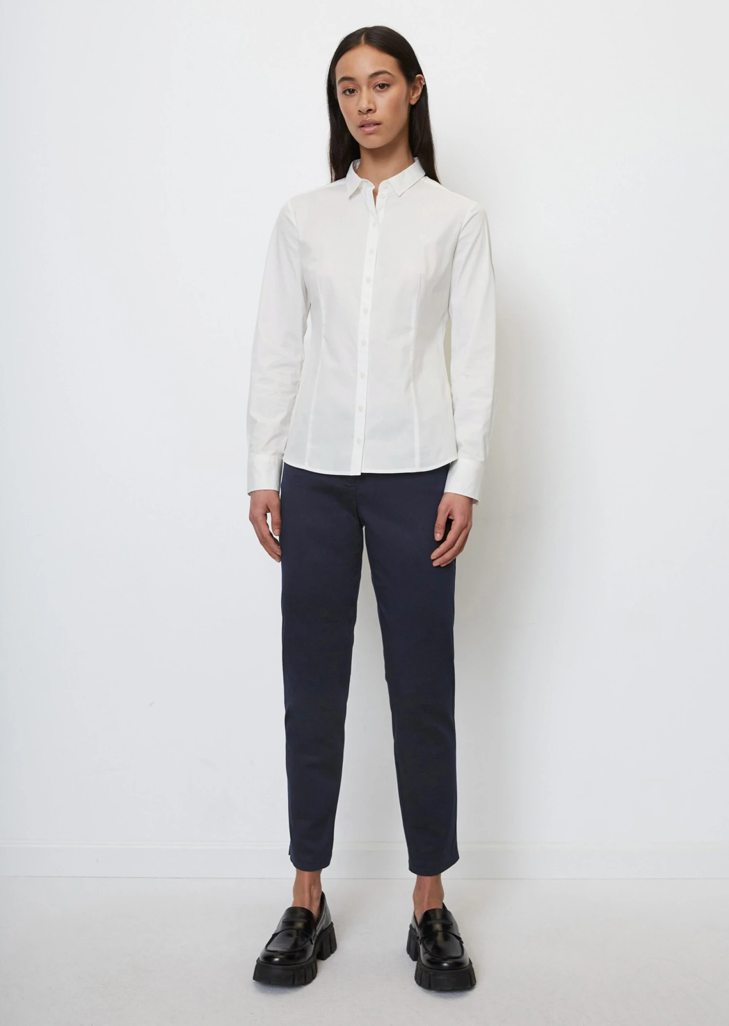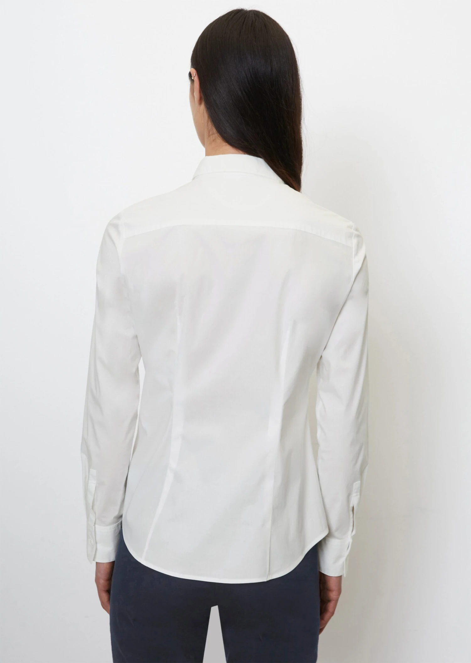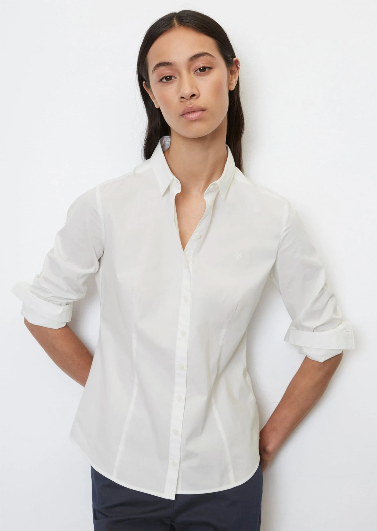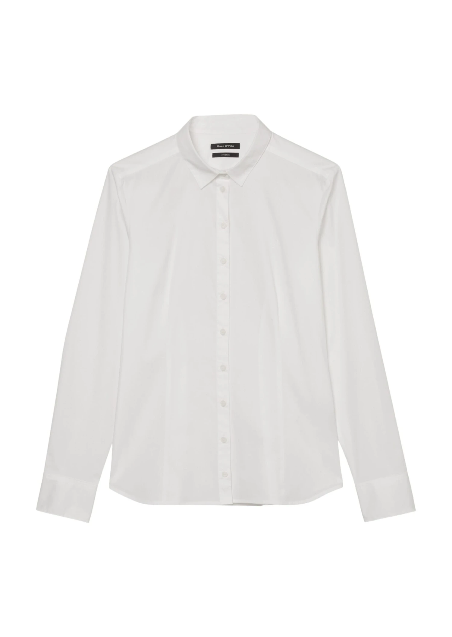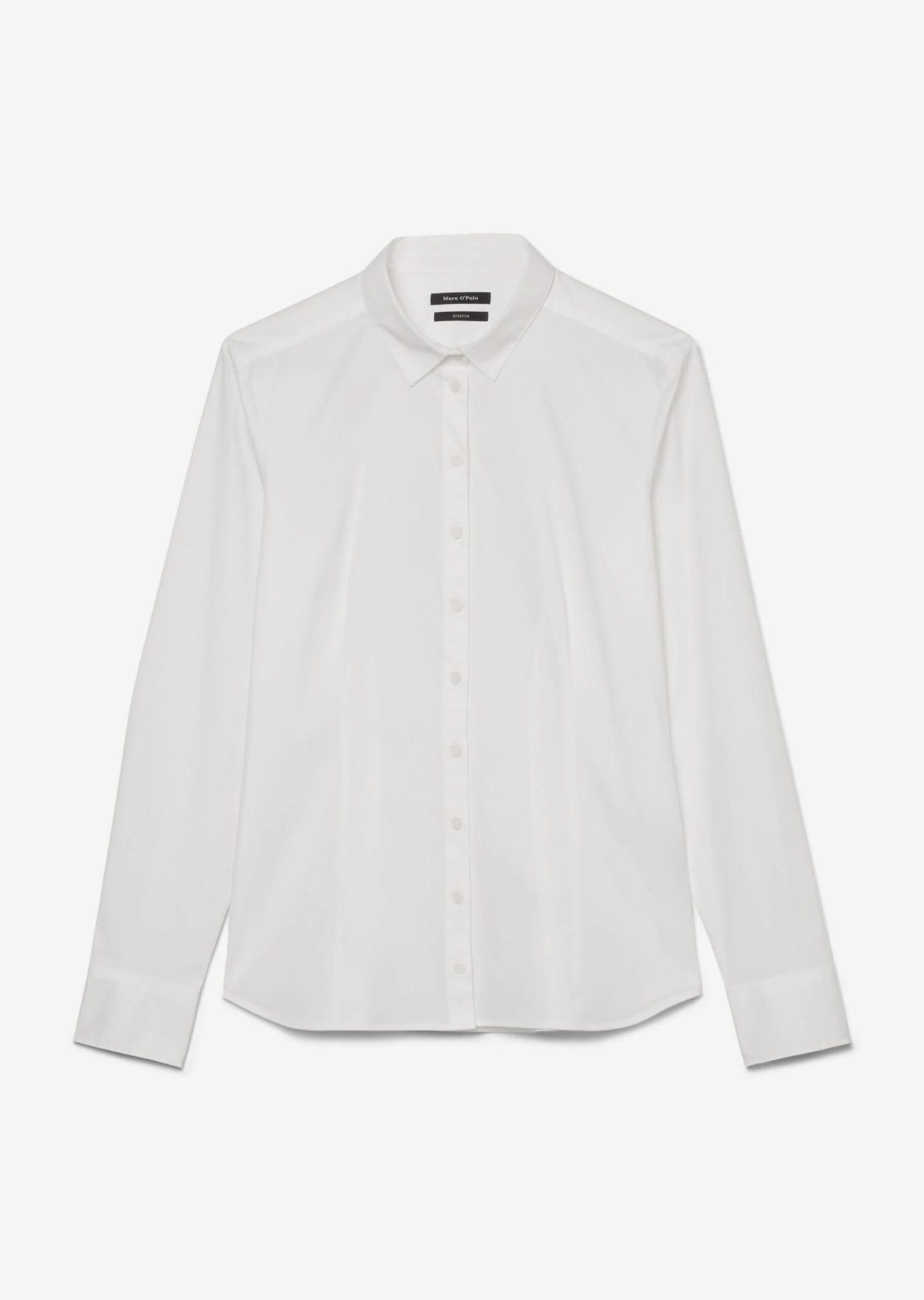 A classic piece with real class: this long-sleeved blouse in high-quality stretch poplin fabric composed of blended cotton. With a Kent collar, full-length button placket and a subtle, embroidered Marc O’Polo logo on the chest. Feminine fit with darts, signature blouse sleeves and a rounded hemline.