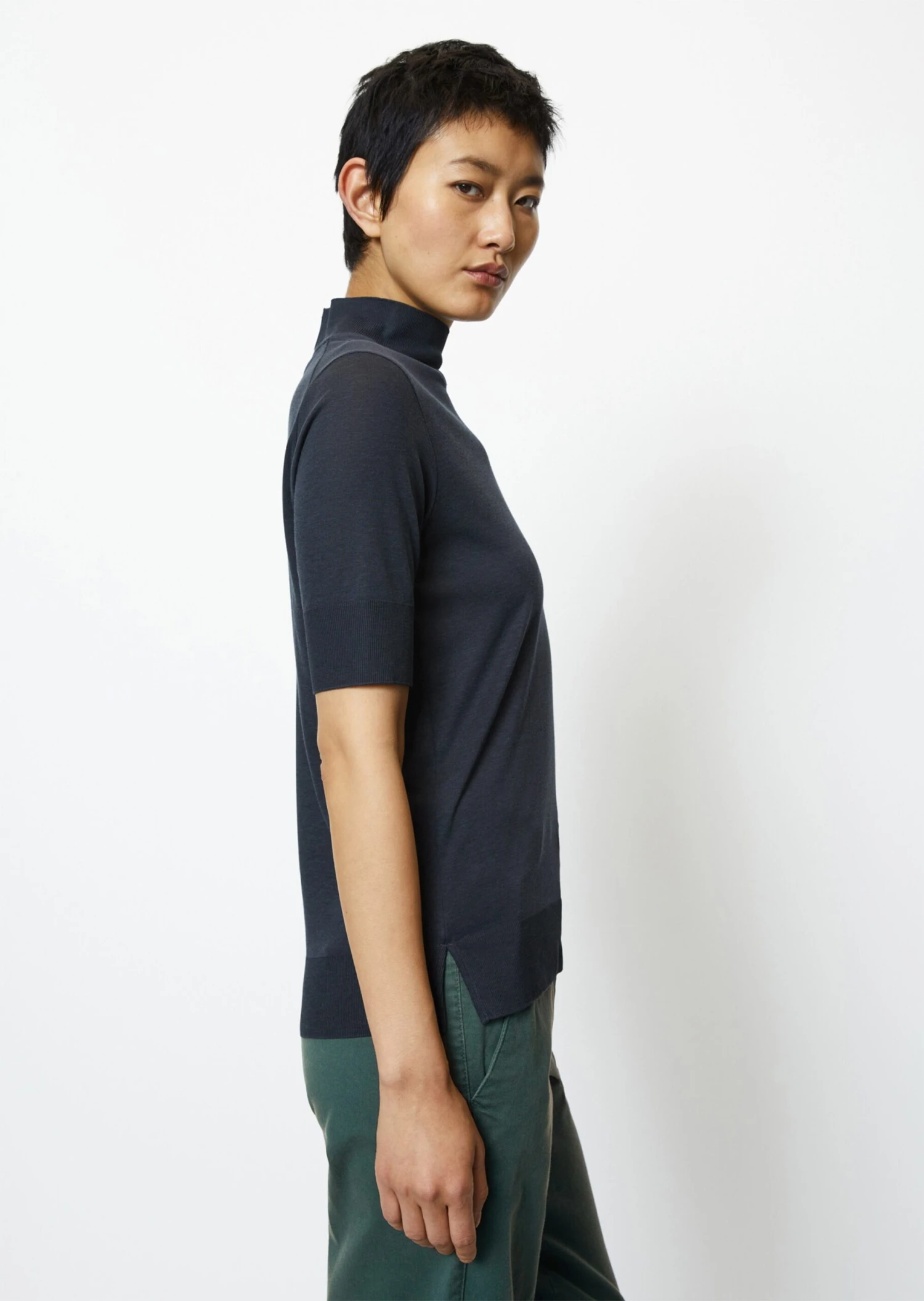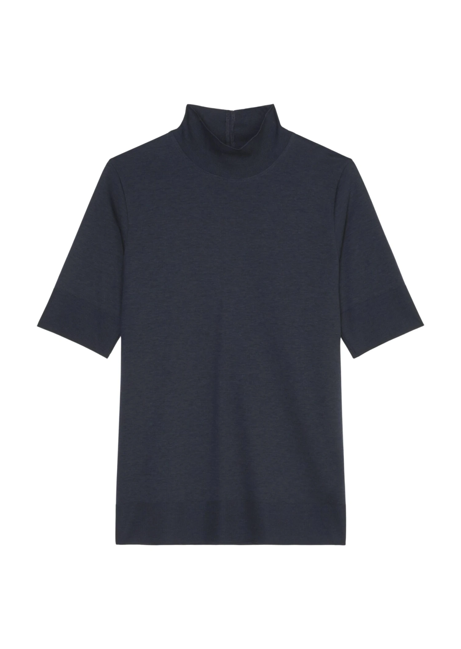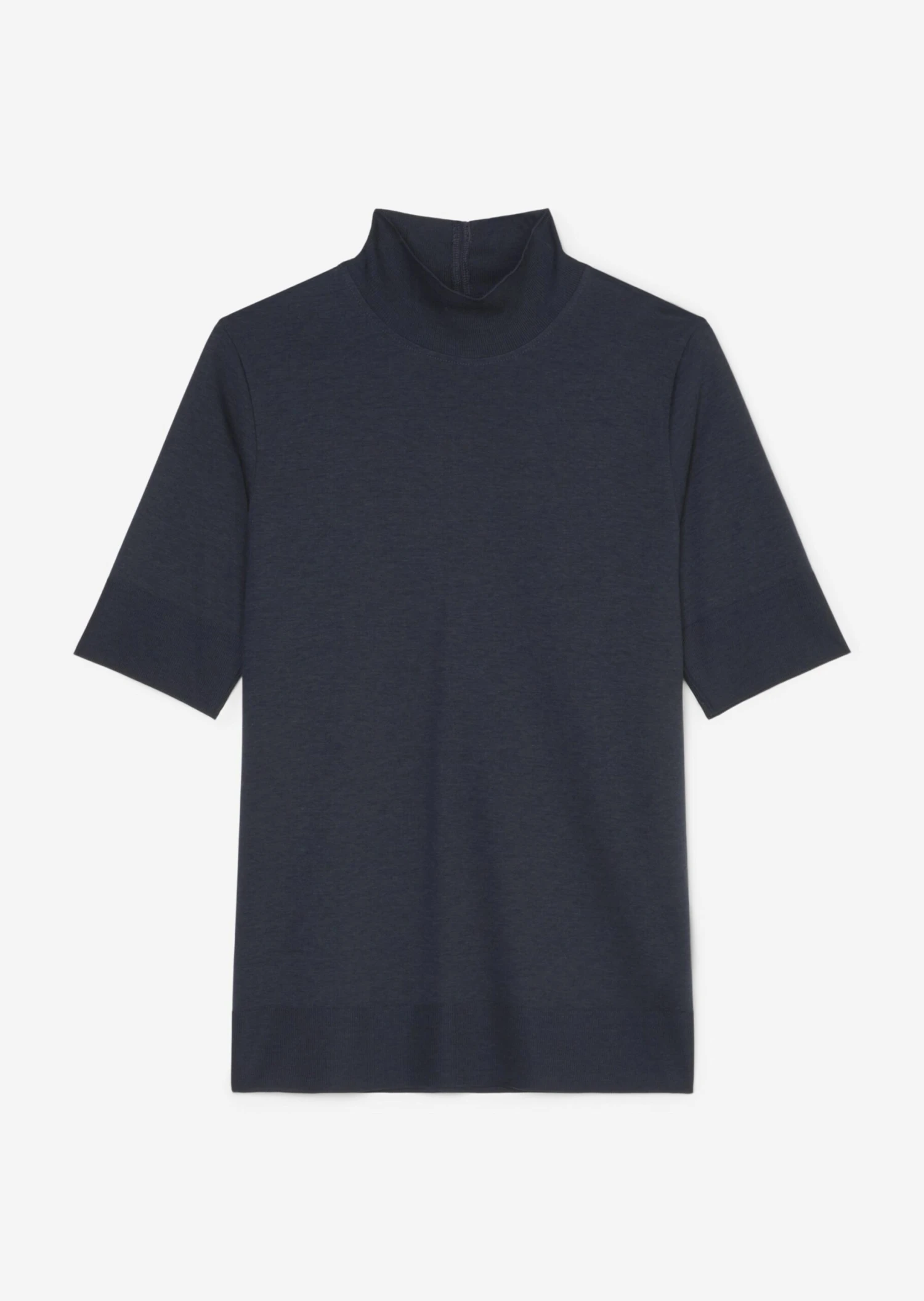 Timeless and classic, but also fresh and modern: the noble T-shirt in fine knit look. The special feature: the exclusive jersey fabric is knitted on special machines, so that it looks visually like a light knit sweater quality. High-quality feature: the fine-ribbed cuffs at the end of the sleeves and hem are thus also not sewn on, but knitted on. Straight cut regular fit with turtleneck and casually slit side seams.