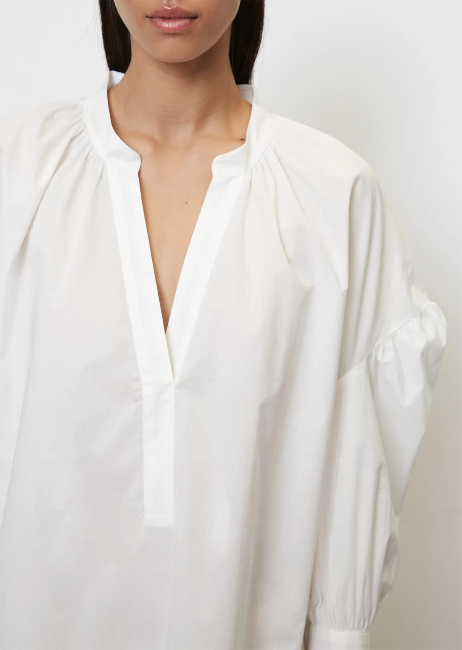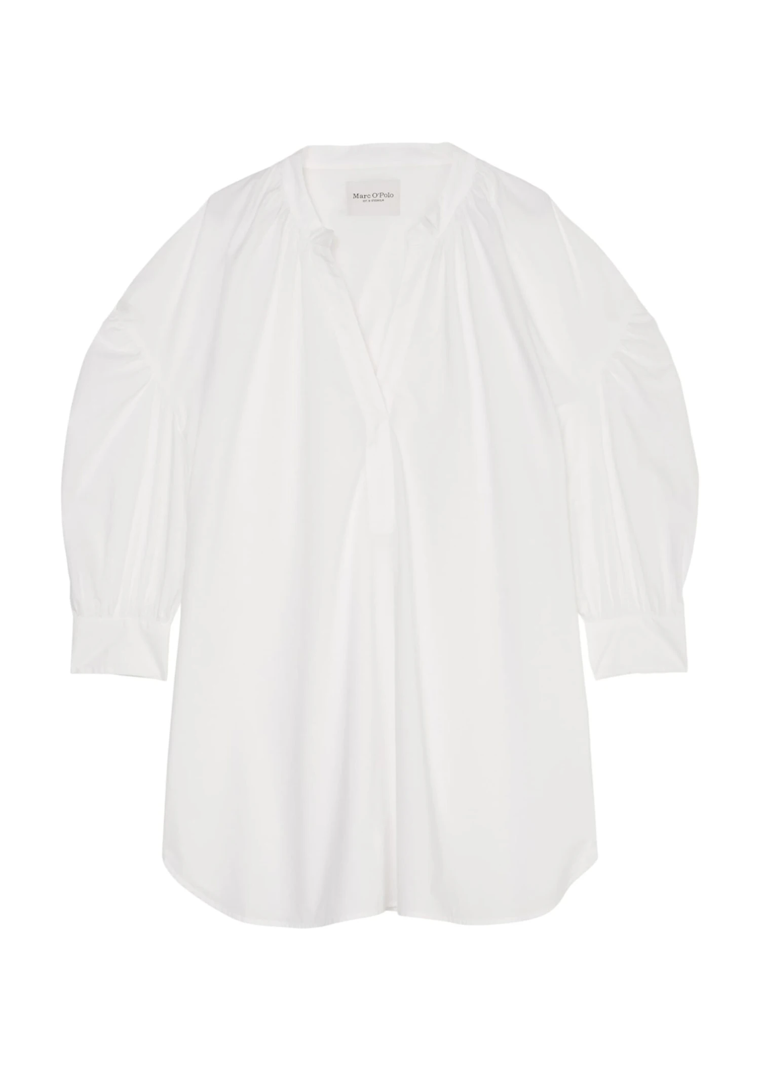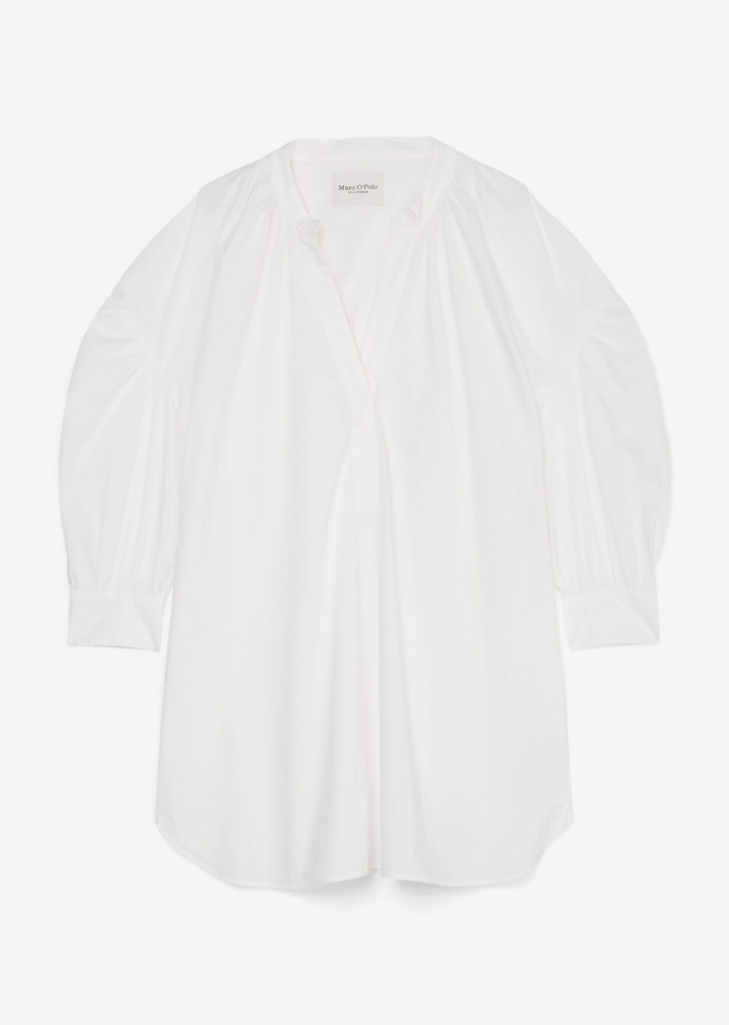 This fresh lounge tunic from the PASSIONATE POPLIN range comes in a relaxed, oversized fit and is summery, lightweight and super cool. It is made of cool, smooth poplin fabric composed of pure organic cotton for maximum comfort and a high-quality look. This piece has a stand-up collar, a deep V-neckline, dropped shoulders and puff sleeves with wide cuffs that fasten with two buttons. The hemline is slightly rounded. Perfect for holiday nights in the south and breakfast with a view of the sea.