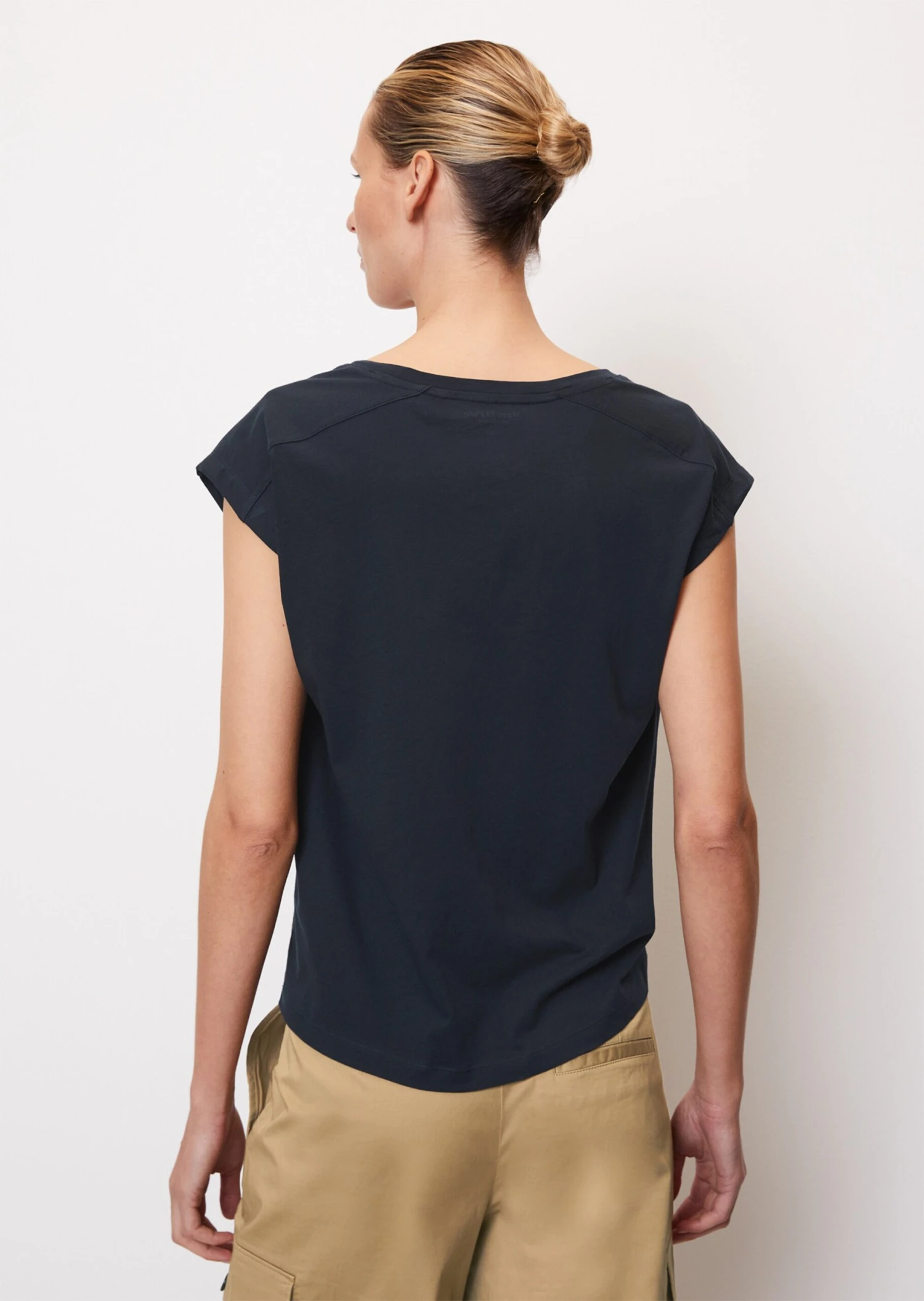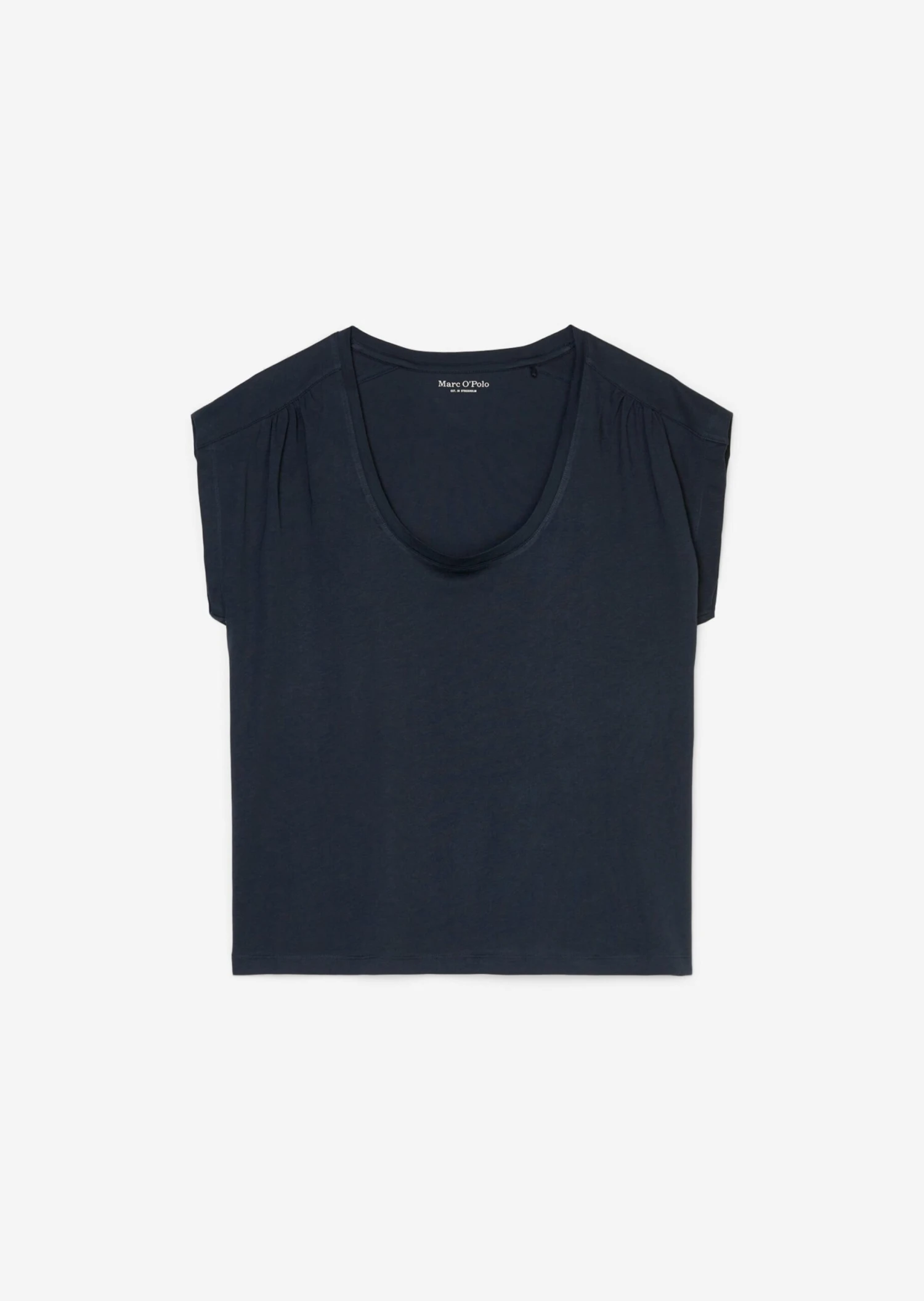 Featuring shoulders with distinctive gathering, this cool and elegant T-shirt is finished in single jersey fabric made of lightweight, soft organic cotton. The sleeveless design comes in a loose regular fit with a deep round neckline and heavily dropped shoulders. The body is finished in a laid-back batwing style. The new, stylish basic piece is the perfect starting point for cool looks and can also be paired with other trend pieces.
