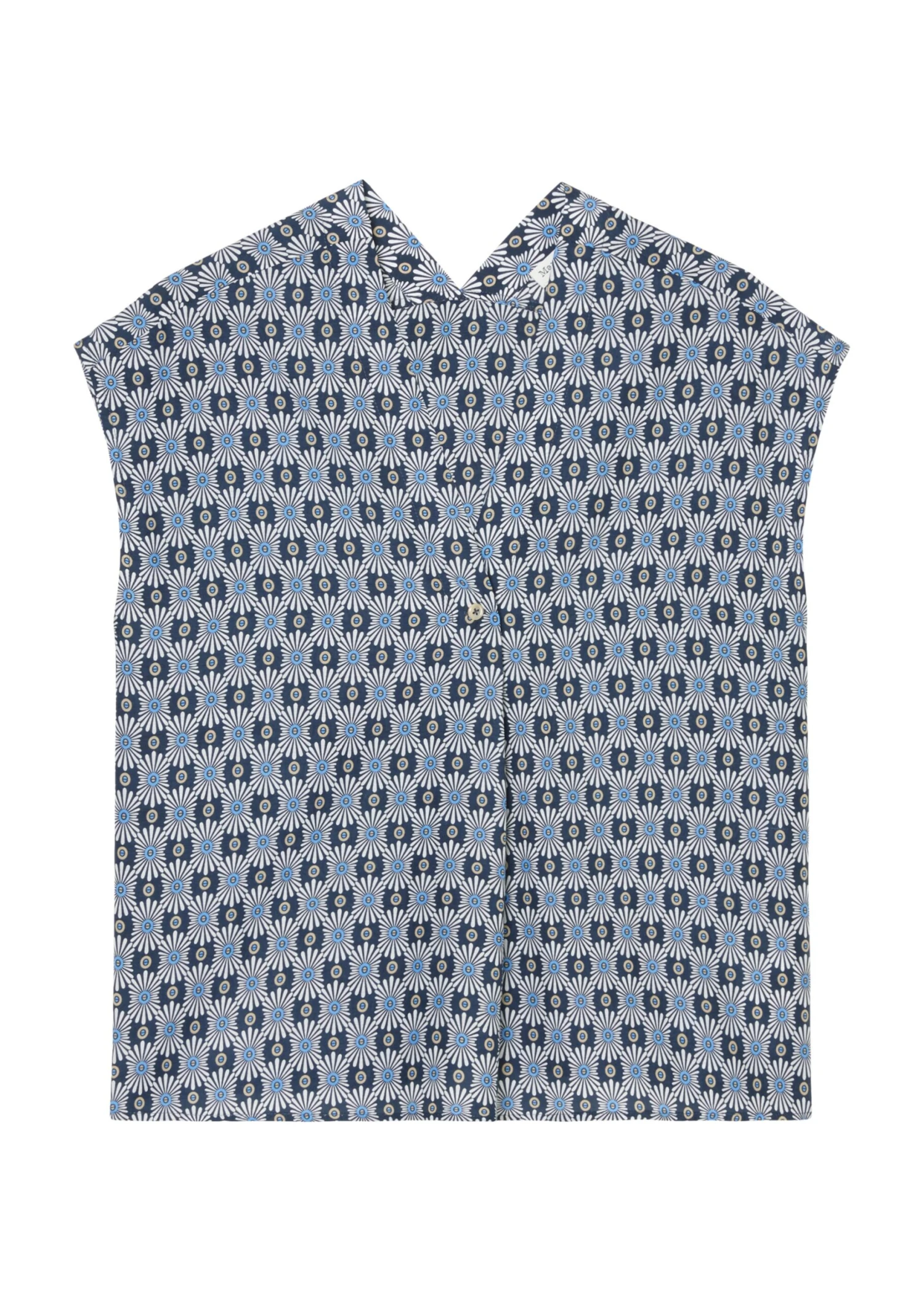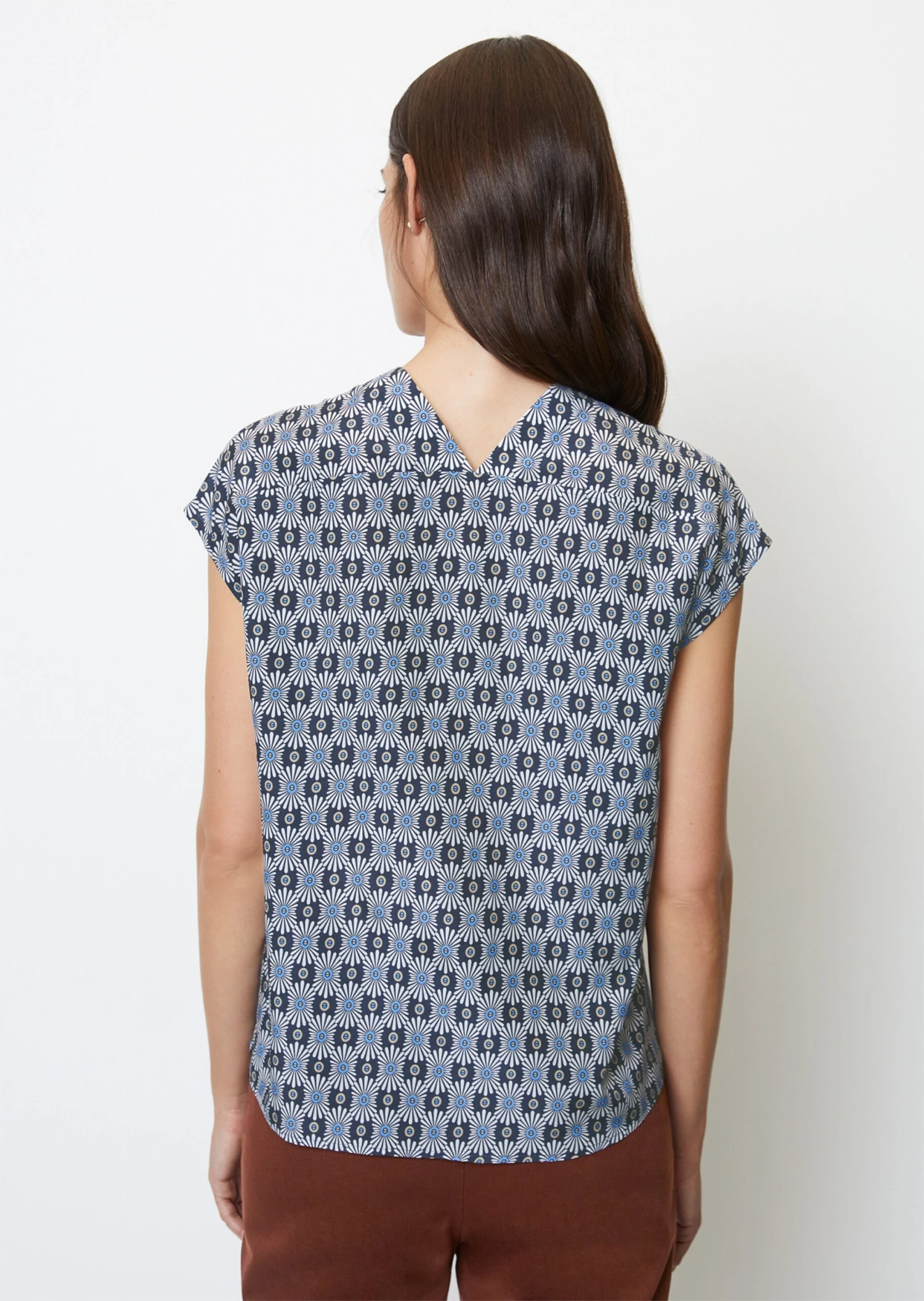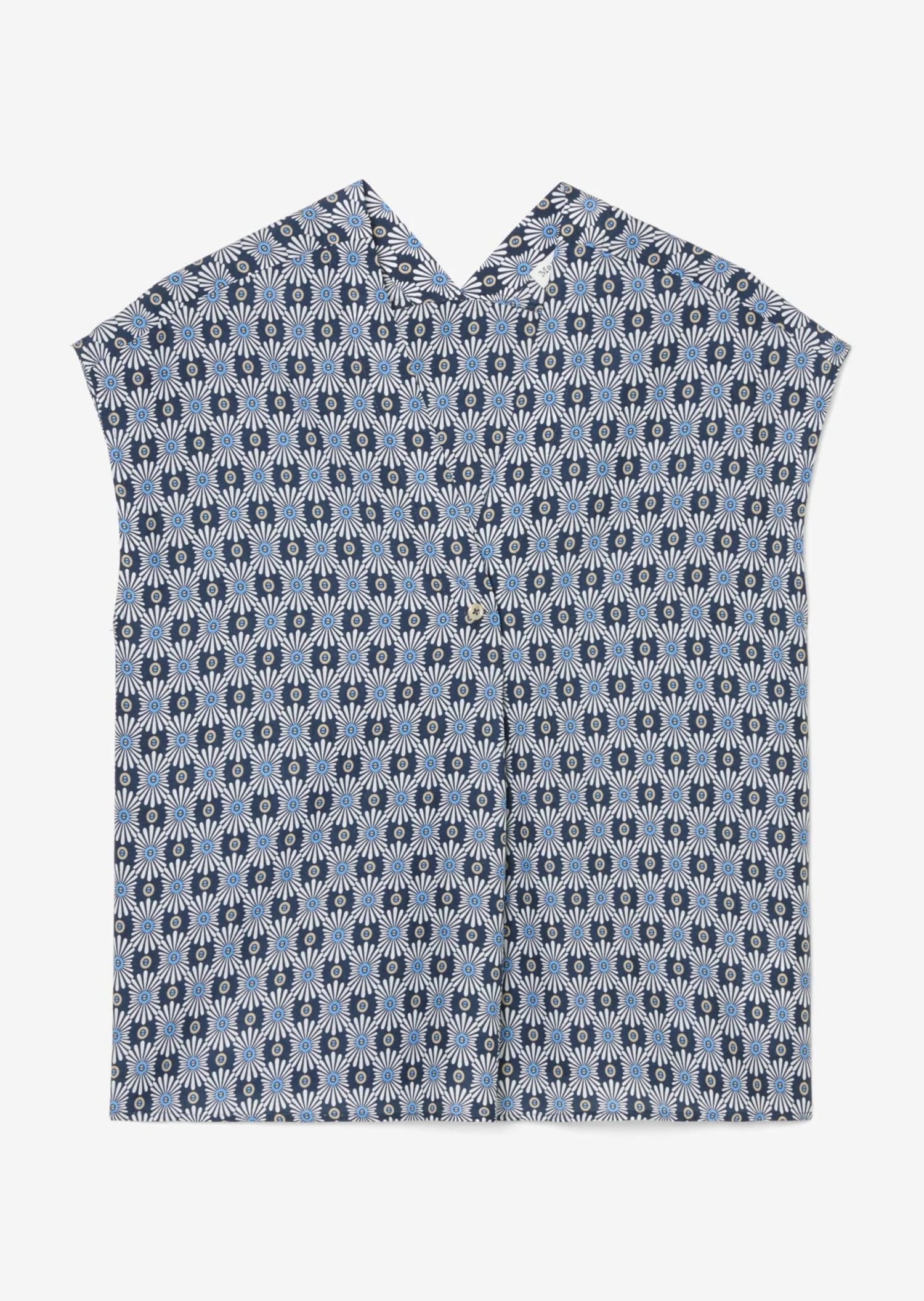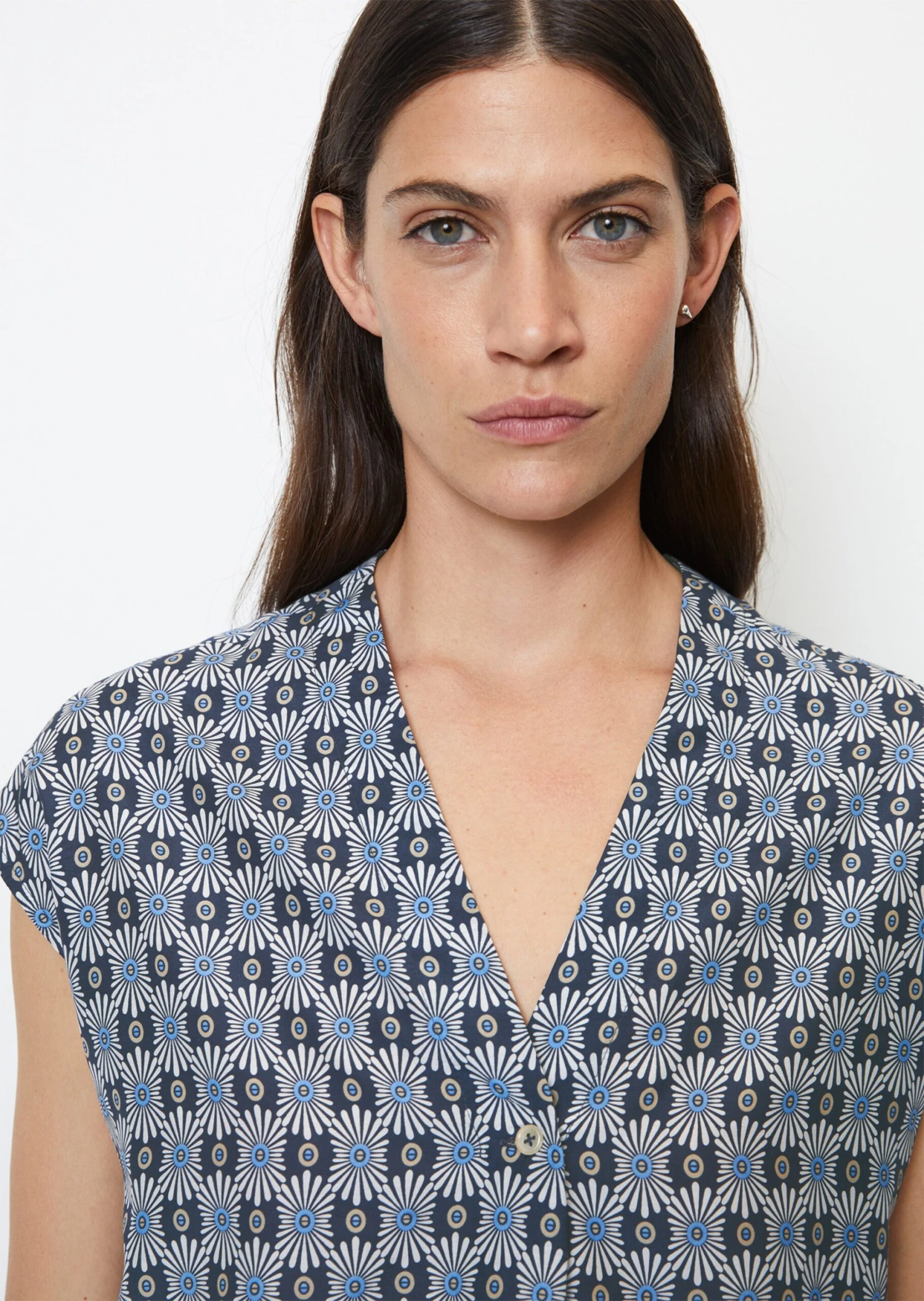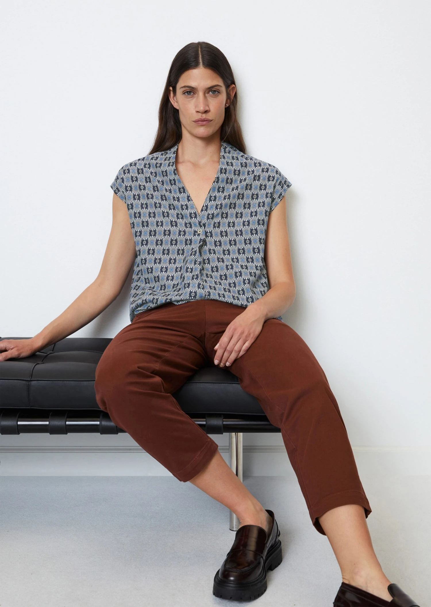 This sleeveless V-neck blouse made of a flowing, incredibly soft organic cotton and viscose blend with an all-over print transforms any outfit from casual to chic in an instant. The blouse boasts a sophisticated cut and is elaborately finished. It also features shoulder seams that are offset to the rear, a genuine mother-of-pearl button, a wide pleat at the centre front and a short V-neck on the back.