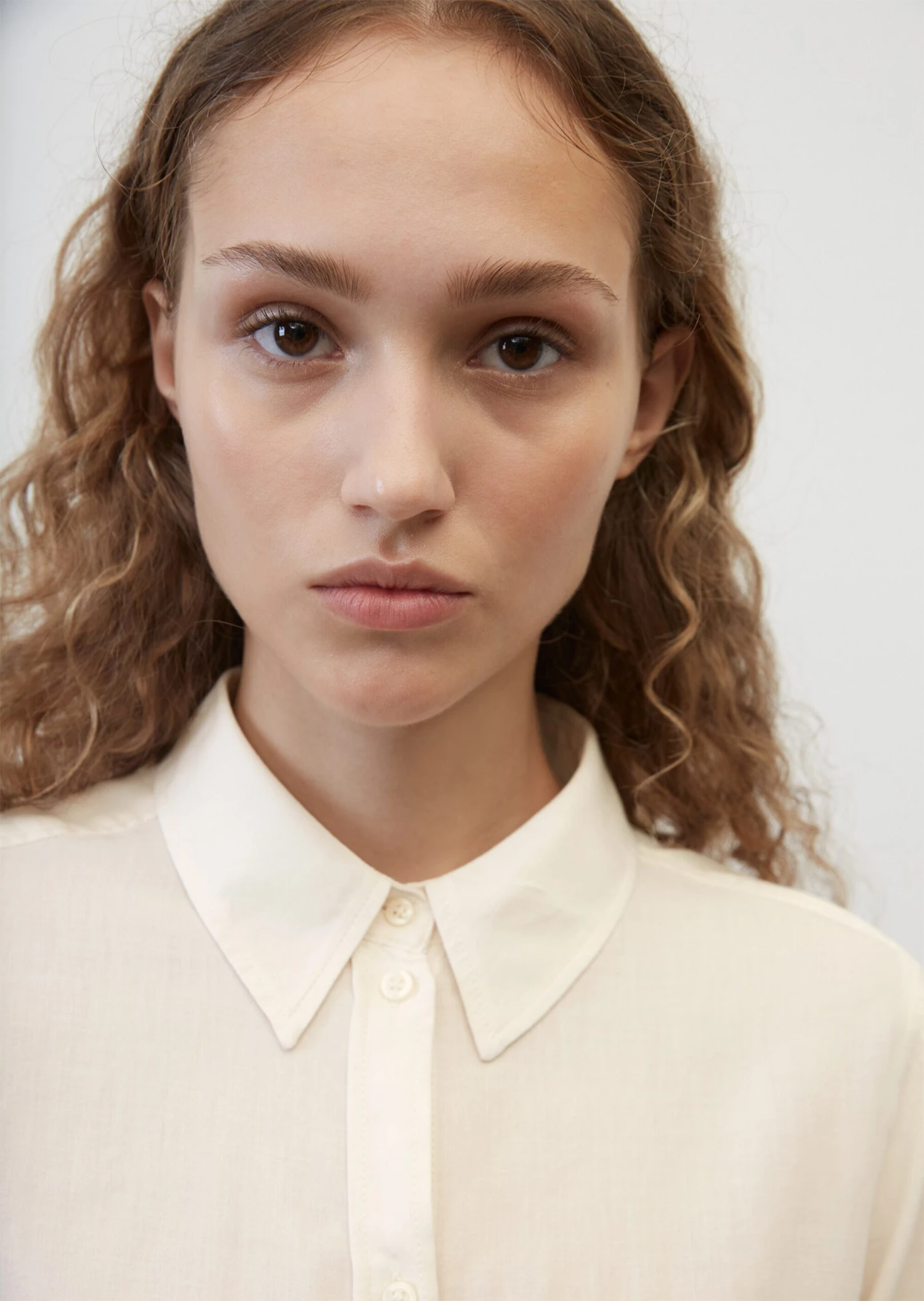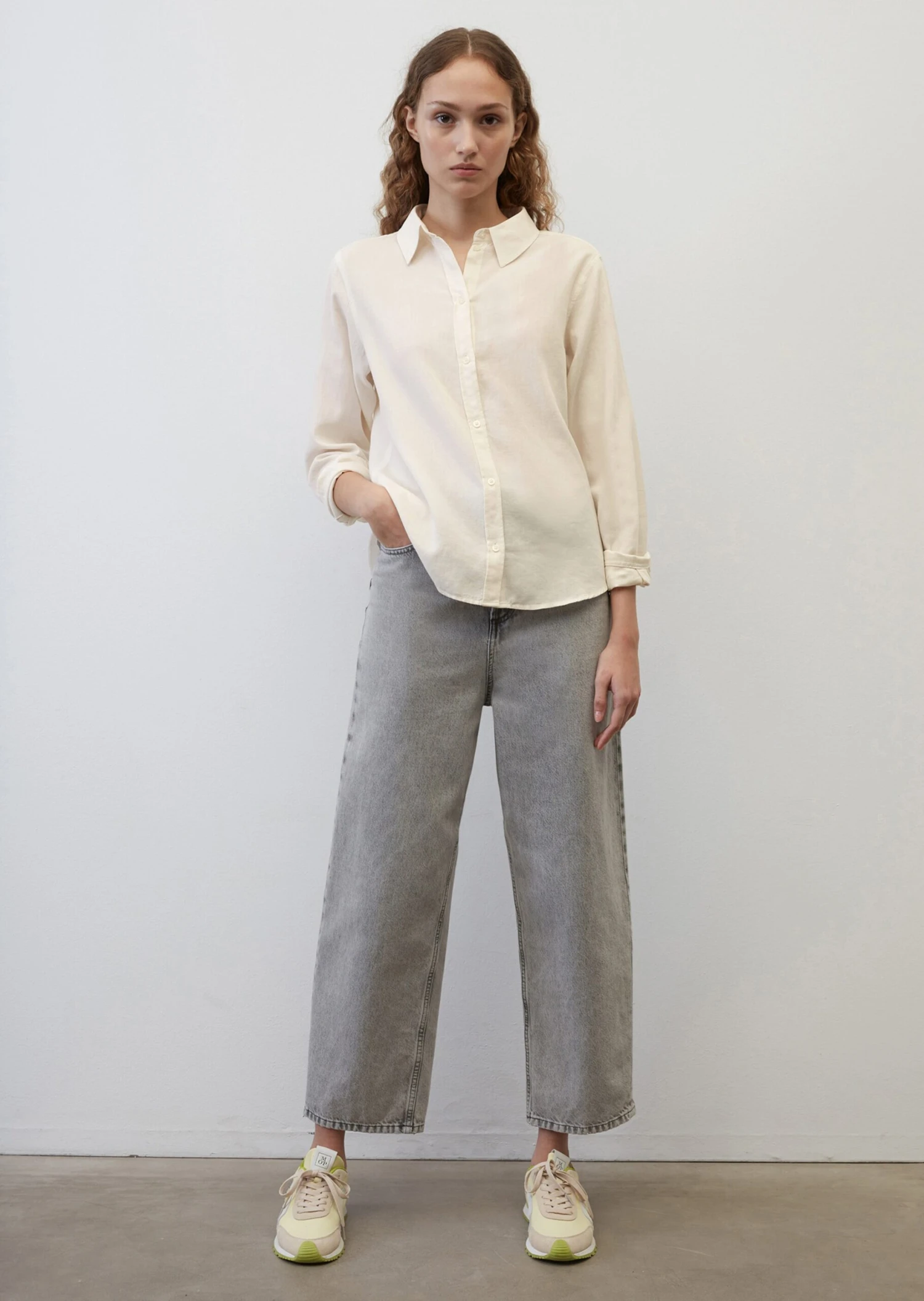 The blouse is a classic piece and a fashion statement all in one. It looks elegant, makes us look professional and offers countless styling possibilities. This slim-fitting, feminine piece is perfect for the office or for mixing and matching as part of a casual outfit. The blouse comes with a pointed Kent collar, a full-length button placket, a back yoke with a box pleat and deep pleated details on the cuffs. The hemline is slightly rounded. It is made of ultra-lightweight, super soft, washed organic cotton with a subtle twill texture.