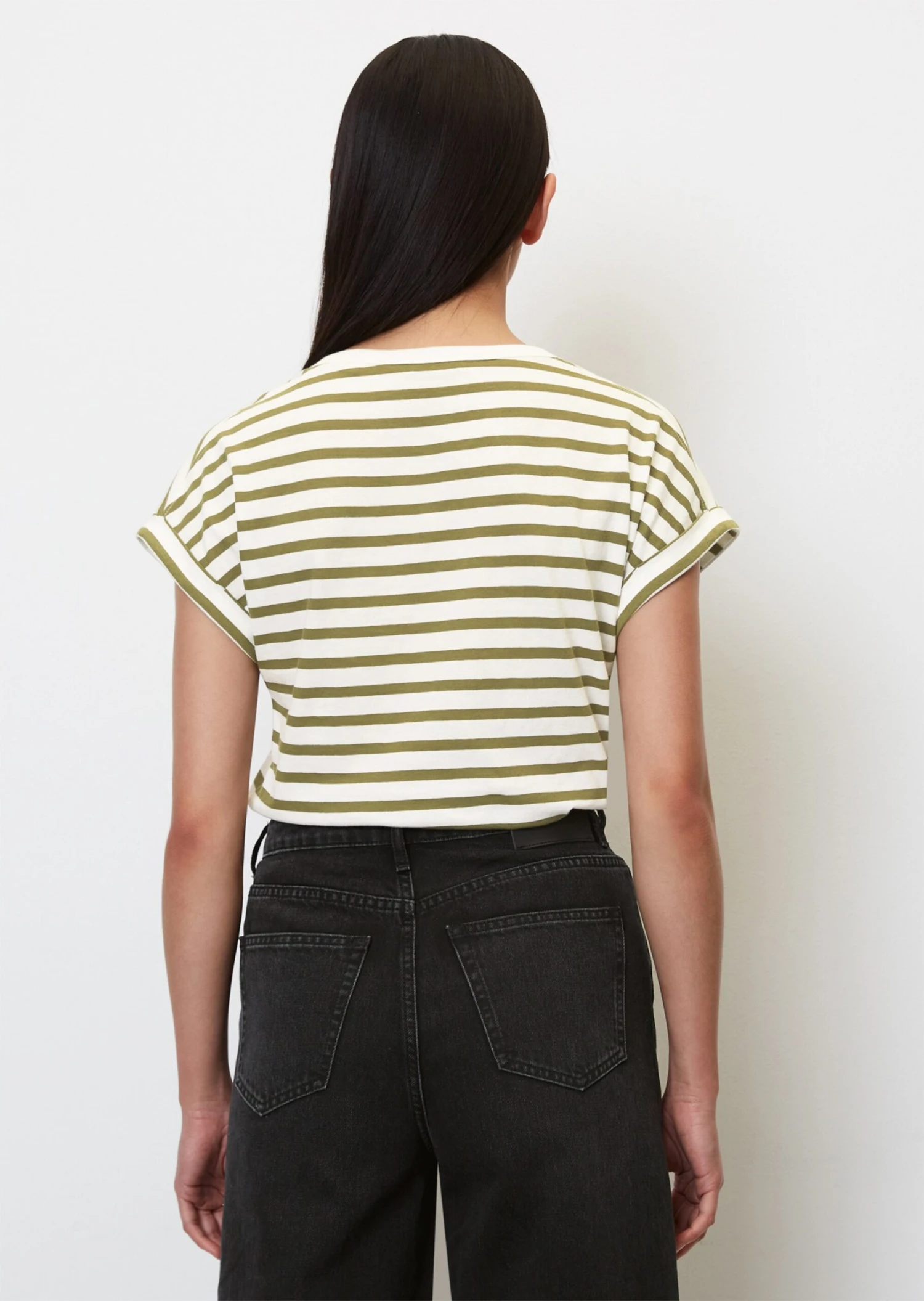 Modern, minimalist and striped. Fresh design for a basic T-shirt. This casual piece is made of fine, lightweight and yarn-dyed single jersey and features a deep round neckline. It is soft against the skin and comes in a regular fit with cut-on sleeves finished with fixed turn-up sleeve hems and a straight hemline.