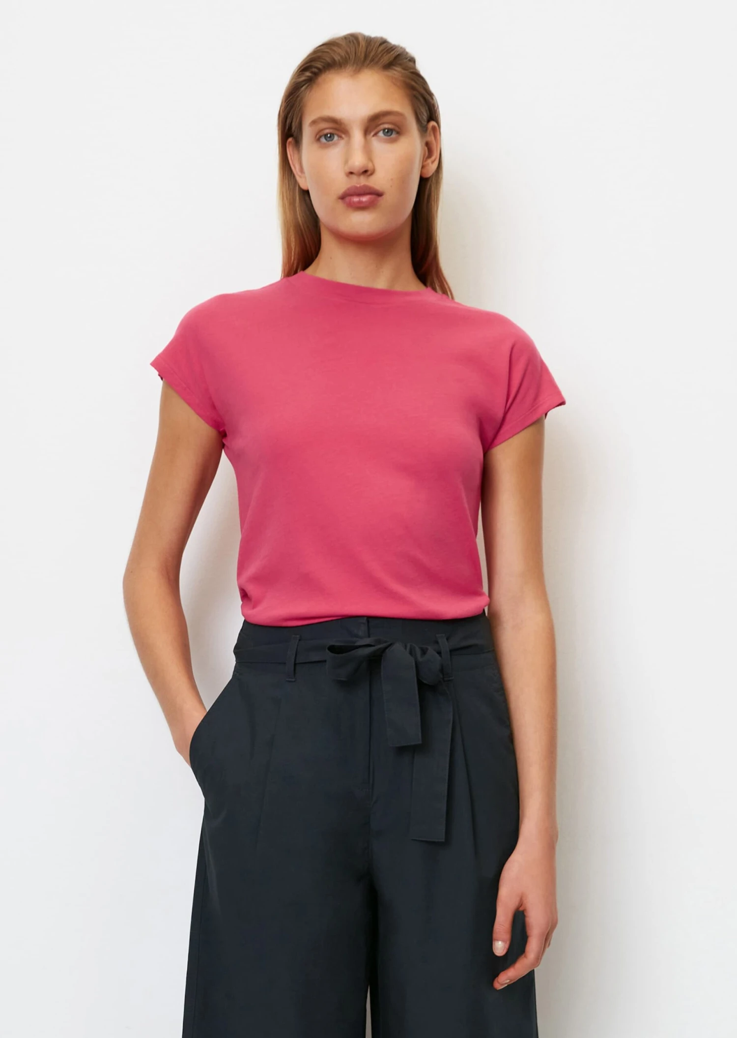 A basic piece with a casual understated character, this modern T-shirt features a high-fastening, ribbed round neckline, short cut-on sleeves and a gently rounded hemline. Made of pure organic cotton single jersey, this piece comes in a regular fit and is super fashionable, offering unlimited styling options.