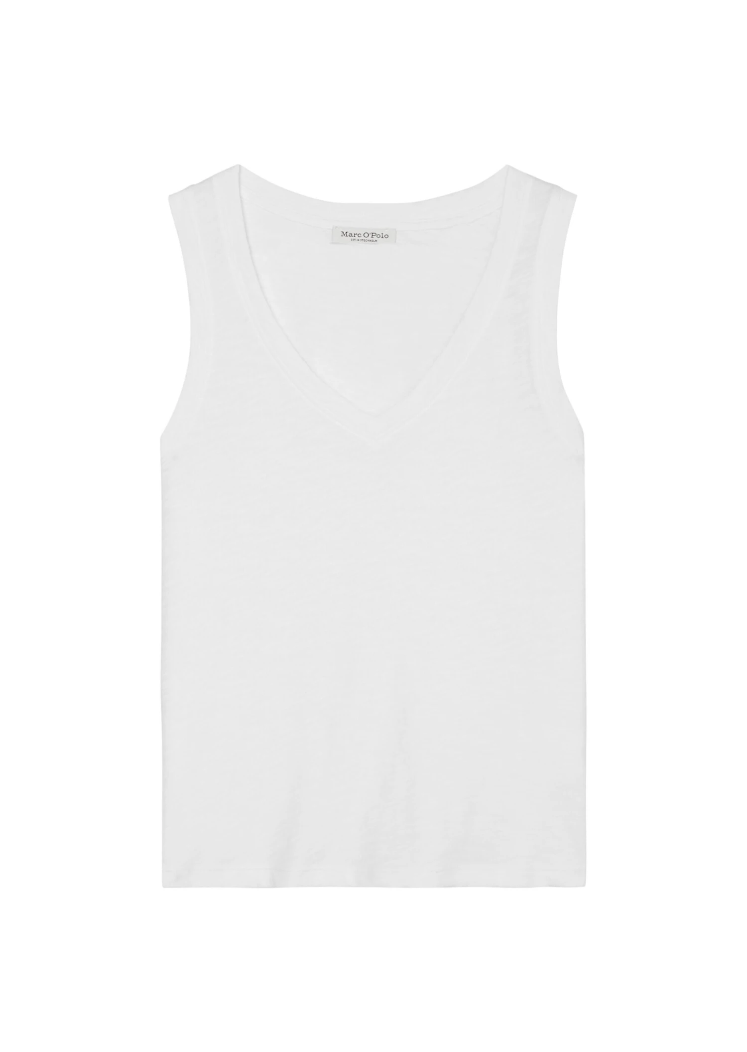 Exclusive Wardrobe Staple made of super soft slub jersey quality in fine Organic Cotton quality. Regular cut, sleeveless V-neck top with narrow shoulder straps and subtly rounded hem line. Ideal summer piece and versatile styling all-rounder with perfect wearing properties.