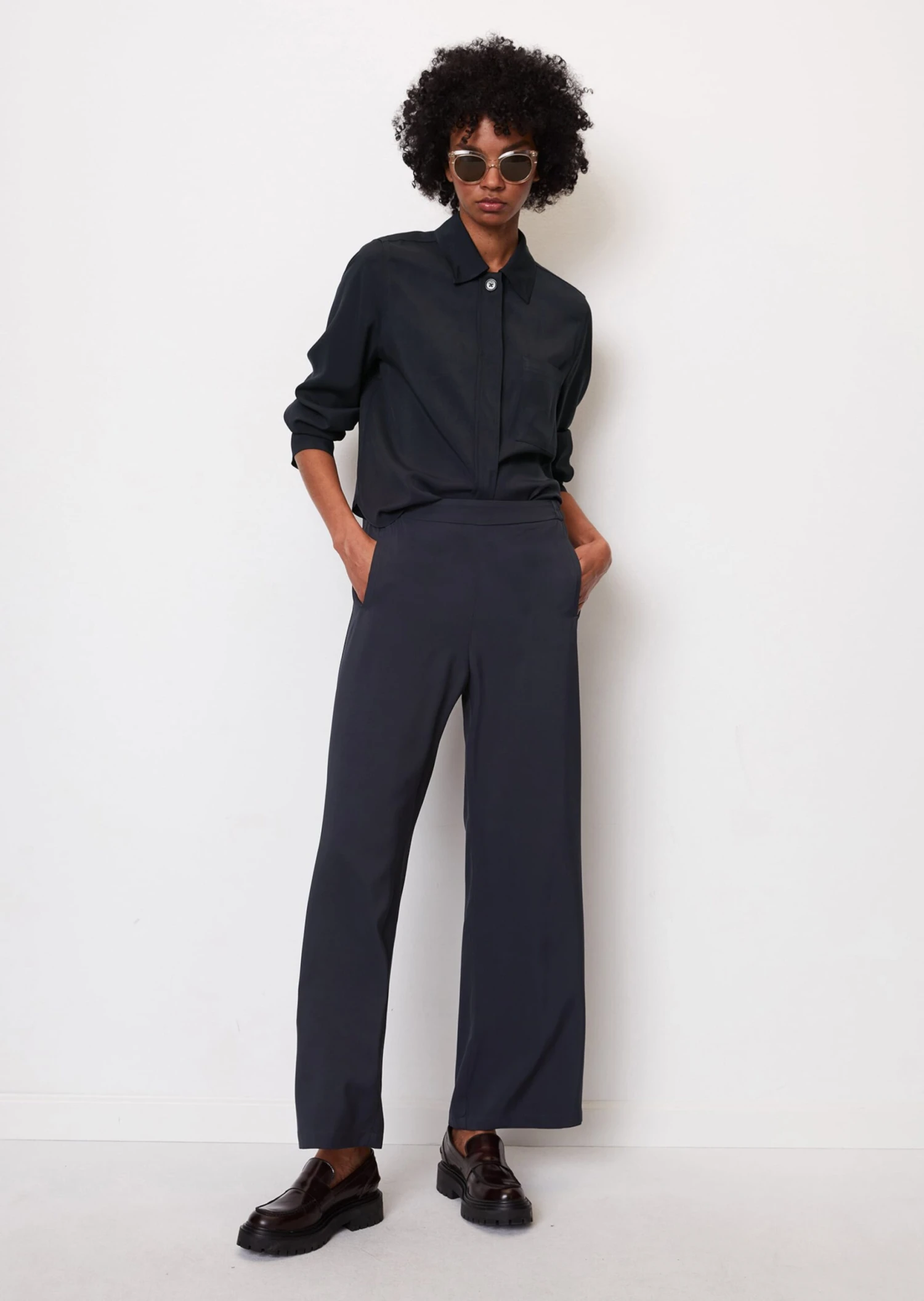 We wear wide pants now – they are super stylish and also make us look slimmer! Practical slip model with partially elastic waistband and discreet, narrow welt pockets. The fit: loose, wide leg, in normal length. The quality: a nobly flowing, soft viscose twill. Styling rule: perfect with cropped sweaters and T-shirts – never combine with a long top, and regular length shirts are best tucked into the front of the waistband to preserve the silhouette. For a trendy co-ord look, combine with the matching overshirt.